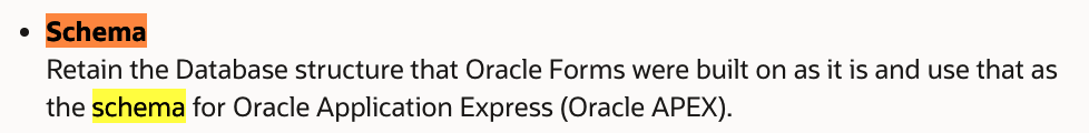 السلام عليكم ورحمة الله في رأيي المتواضع في أغلب مشاريع Migration فإن الأفضل هو ( ابقاء نفس التصميم والبنية ) لقواعد البينات .... هذا اذا فرضنا ان التصميم الحالي احترافي ويتبع أفضل الممارسات Best practices هذا بالإضافة إلى رضاكم عن الأداء وقيامكم بكل ما يتيسر لكم القيام به من Optimization and Performance Tuning أما لو كنتم غير راضين عن التصميم الحالي فلعلكم تبحثون في Best Practices of Designing DB Schema(s) for Oracle APEX Applications على أي حال، لاحظ ما تم كتابته في هذا الحل المقترح المرجعي Reference Architecture من Oracle Cloud Infrastructure علما بأن الانتقال الى Oracle Cloud Infrastructure سيعطيك العديد من الخيارات على سبيل المثال لا الحصر Identity and Access Management لتقسيم وتنظيم الوصول للانظمة المختلفة و ايضا اعطاء Tags على Cloud Resources لمعرفة ما هي ال Cost الذي تتحمله لها تحديدا وبلا شك الميزة الهامة جدا بناء تطبيقاتك على Autonomous Database و غيرها الكثير المرجع Migrate Oracle Forms applications to Oracle APEX on a VM DB system ولا تنسونا من صالح دعائكم ودمتم بخير وعافية محمود ربيع