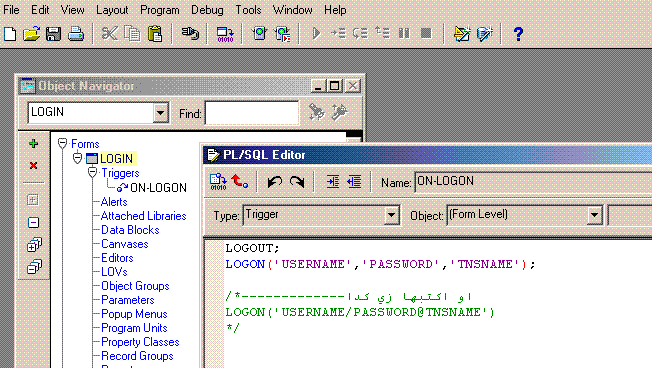 بتاريخ: 21 يونيو 200619 سنة comment_72750 ياشباب بس هذة الطريقة تخلي اسم المستخدم وكلمة المرور مكشوووفة انا عندي طريقة احسن بكتير فك شاشة الدخول تبعك وعلى مستوى الفورم اختر TRIGGER الى اسمة ON-LOGON اكتب فيه هذا الكود LOGOUT; LOGON('USERNAME','PASSWORD','TNSNAME') او بمكانك كتابتها مرة واحدة زي كدا LOGON('USERNAME/PASSWORD@TNSNAME') تقديم بلاغ