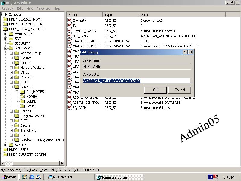 بتاريخ: 1 يناير 200620 سنة comment_56311 الاخ الكريملتعريف الاوراكل على الويندوز ادفانس سيرفر يلزمك تعريفها على الشكل التالي في regedit وليس كما تفضلت لأنها تؤثر في ExportArabic_America.AR8ISO8859P6هذا هو الذي يتعامل معه الاوراكلكما تأكد من ان الويندوز معرف اللغة العربية كما في الصورة المرفقة تقديم بلاغ