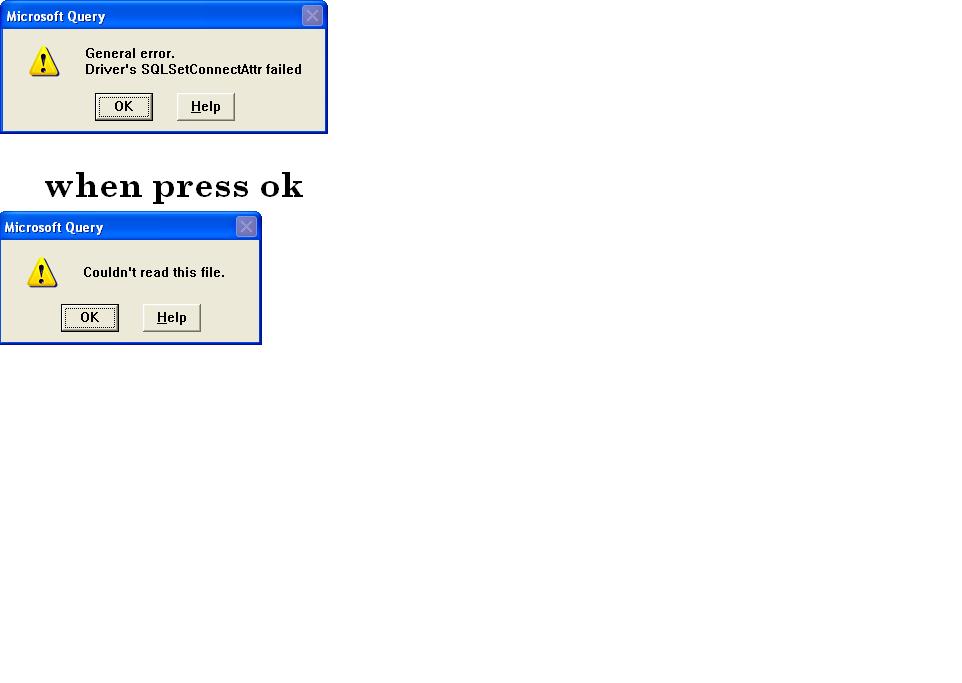 بتاريخ: 13 يونيو 200619 سنة comment_72006 السلام عليكم عنلت درايفر خاص بالاوراكل odbcعند الذهاب الىdata/import external data/new database queryin excleواستخدم اسم الدرايفر odbcبعد عمل الاتصال وطلب الباسورد لل db يضهر الخطا التالي في المرفق مع السكر الجزيل تقديم بلاغ