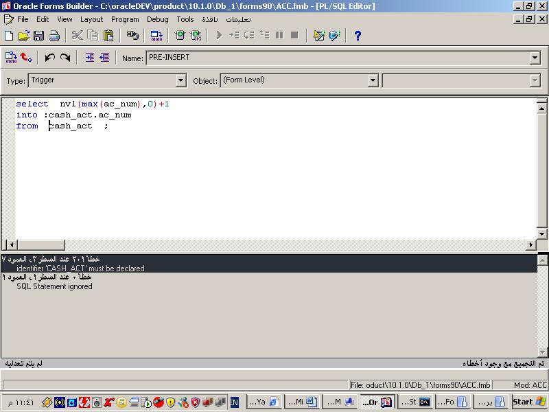 بتاريخ: 28 أغسطس 200619 سنة كاتب الموضوع comment_77488 الاخوة الاعزاءالكود كالتالى select max(nvl(ac_num ,0)+1)into bank_act.ac_numfrom bank_act;ورسائل الخطأ كالتالى خطأ 201 identifier ' bank_act' must be declared خطأ 0 sql statment ignored تقديم بلاغ