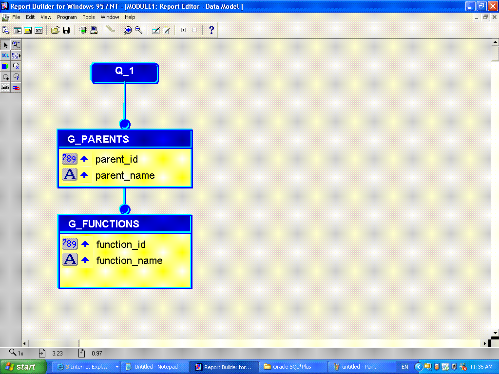 بتاريخ: 29 أكتوبر 200619 سنة comment_81638 لنفرض أن لديك جدول اسمه (functions) بهذا الشكل SQL> DESCRIBE functions Name Null? Type ------------------------------- -------- ---- FUNCTION_ID NUMBER FUNCTION_NAME VARCHAR2(20) PARENT_ID NUMBER فتكون كتابة الquery بهذه الصيغة SELECT P.function_id parent_id ,P.function_name parent_name , F.function_id , F.function_name FROM functions P , functions F WHERE P.function_id = F.parent_id ثم نقسم الأعمدة على مجموعتين كما في الصورة المرفقة تقديم بلاغ