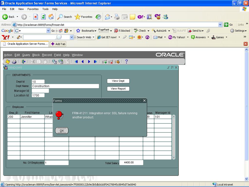 بتاريخ: 27 أكتوبر 200619 سنة comment_81501 من help Errors FRM 41211 Integration Error: SSL Failure Running Another Product. Symptoms "Frm-41211 Integration Error Ssl Failure Running Another Product" error while calling a report from form that is invoked by a shortcut place in the desktop. The Form runs fine when running from forms builder. Cause This is caused by the incompatibility introduced by the shortcut settings in XP. Fix In the Properties of the shortcut goto Compatibility-->Compatibility Mode tab. There uncheck the "Run this program in compatible mode for..." option. This will revert the default compatibility. This solves this issue. . تقديم بلاغ