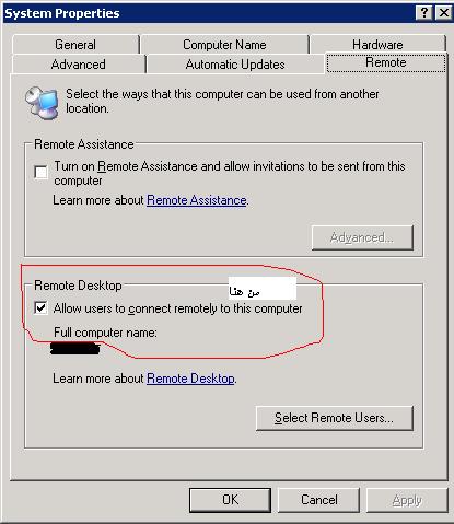 بتاريخ: 23 أغسطس 200718 سنة comment_108119 أخي الفاضل:يجب عمل إعدادات في جهاز السرفر للسماح بالإتصال به من خلال سطح المكتب البيعد وذلك يتم كالتالي1) إنقر على رمز جهاز الكمبيوتر الموجود على سطح المكتب بزر الفارة الأيمن ثم إختار Properties2) يظهر معاك مربع الحوار System Properties قم بتحديد التبويب المسمى Remot 3) حدد الخيار الموجود كما بالصورة التالية 4) إنقر زر select remot users وحدد المستخدمين الذي تريدهم أن يتصلو بالسرفر في حالة إستخدام الدومين5) في حالة عدم إستخدام الدومين يجب إنشاء مستخدمين على السرفر بنفس أسماء المستخدمين الموجود على الكلاينت6) قم بالإتصال بجهاز السرفر من أي جهاز كلاينت على الشبكة وذلك بكتابة ip بتاع جهاز السرفر أو إنك تكتب اسم جهاز السرفرإنظر الصورة في المرفقاتمع تحياتي تقديم بلاغ