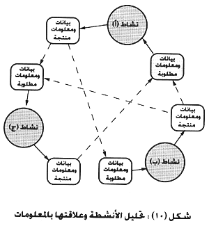 يتم في هذه المرحلة تحديد الأنشطة والعمليات المختلفة التي يقوم بها النظام مع تحديد للبيانات والمعلومات اللازمة وما تنتجه من معلومات تؤثر على عمليات وأنشطة أخرى داخل النظام . ويبين الشكل (10) ارتباط النشطة وعلاقتها بالمعلومات .