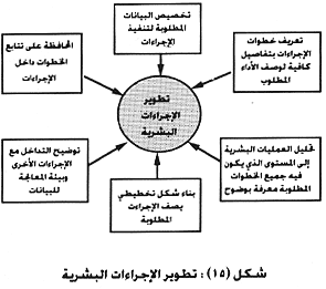 الإجراءات البشرية هي مجموعة من الأوامر التي تعين سلوك فعل يتبع بإحكام تحت شروط معينة . وأثناء هذه المرحلة تمتد العمليات البشرية داخل الإجراءات خطوة فخطوة . وكل خطوة يتم وصفها بوضوح وبطريقة مباشرة. وبالإضافة الى ذلك يتم إنشاء القوائم لكافة مدخلات المستندات والمخرجات والملفات اليدوية وأوجه التداخل بين الإنسان والآلة المتعلقة بهذا الأجراء. ويوضح الشكل (15) الخطوات التنفيذية لإنجاز هذا النشاط.