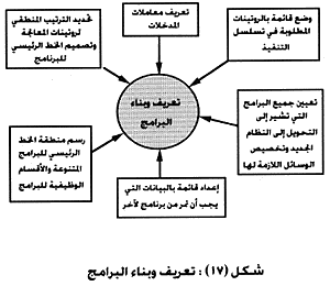 في هذه المرحلة يتم ضم العمليات التي تؤدي في النظام وتقسيمها الى مواصفات برامج . ويتم هذا التجميع في العادة على أساس تماثل المنطق أو متطلبات البيانات أو تسلسل الوظائف أو مزيج من هذه الأسس . وتعاريف البرامج قد تأخذ في الاعتبار التنفيذ المتتابع والذاكرة المتاحة المتوقعة والحجم التقديري لأجراء البرنامج . ويوضح الشكل (17) الخطوات التنفيذية لإنجاز هذه المرحلة .