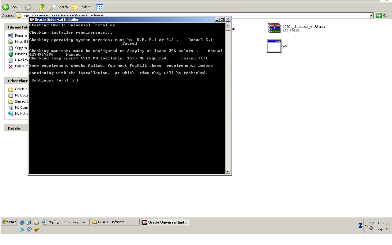 بتاريخ: 17 مارس 200719 سنة comment_94133 السلام عليكملقد قمت بتحميل الداتا بيس والديفلوبر سوت من موقع اوراكل وقمت بتنصيب الداتا بيس بشكل كامل بدون اي مشاكل ولكن عندما اضغط على ال sutup للديفلوبر سوت فانة تكون هناك اخطاء اثناء عملية الفحص للنضام التي يقوم بها قبل التنصيب وبالتحديد يقول ان هنالك مساحة تسمى swap وهي غير كافية وفي المرفق صورة للخطا الذي يضهر فارجو ممن لدية طريقة لحل هذا الخطا ان يساعدني بة لاني محتاج لتنصيب الديفلوبر بسرعةمع الشكر عليالقاهرة مصر تقديم بلاغ