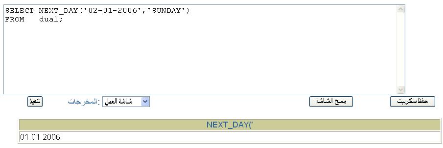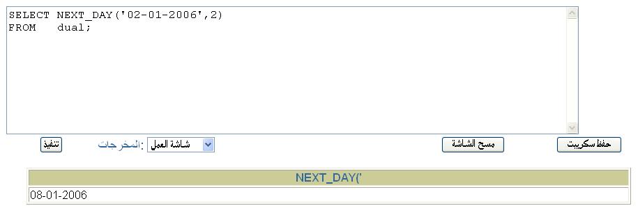بتاريخ: 27 يونيو 200718 سنة comment_103537 الاخوة الاعزاءالسلام عليكم ورحمة الله وبركاتهدالة NEXT_DAY احد دوال التاريخالمفروض انها تعطى التاريخ القادم لليوم المحدد بها مثلا ( اريد ان اعرف تاريخ يوم الاحد القادم من تاريخ 2/1/2006 ) SELECT NEXT_DAY ('02-01-2006','SUNDAY') FROM dual; المفروض انها تعطى تاريخ 8/1/2006 ولكنها تعطى تاريخ 1/1/2006انظر الصورةلكن عندما استخدم الارقام بدلا من اسم اليوم تكون النتيجة صحيحة SELECT NEXT_DAY ('02-01-2006',2) FROM dual; انظر الصورةلماذا تعطى هذة النتيجة الغريبة مع استخدام اسم اليوم ولكنها تعطى النتيجة الصحيحة مع استخدام رقم اليومملحوظة يجب ان تكون لغة التاريخ اللغة الانجليزية والا لن تعمل معكمللاخوة الذين يوجد عندهم التاريخ باللغة العربية يمكن ان يستبدلوا SUNDAY ب الأحدجزاكم الله خيرا تقديم بلاغ