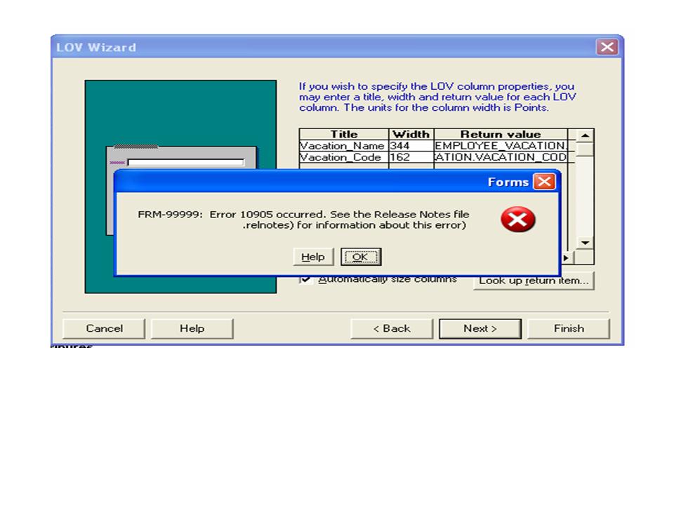 بتاريخ: 2 سبتمبر 200718 سنة comment_109017 اريد ان انشئ (LOVs) ينظر الى display item تظهر رسالة بخطأ رقم FRM-99999 Error 10905 و فى نفس الوقت displayitem الذى تم انشأه فى الشاشة تجعل البيانات لا تظهر تقديم بلاغ