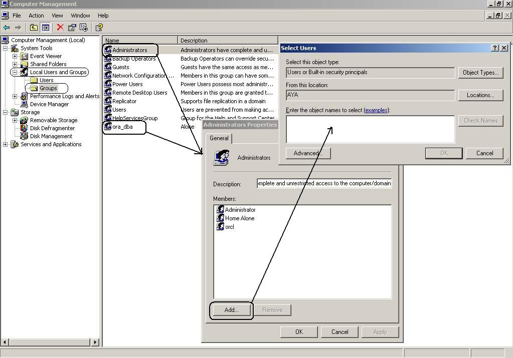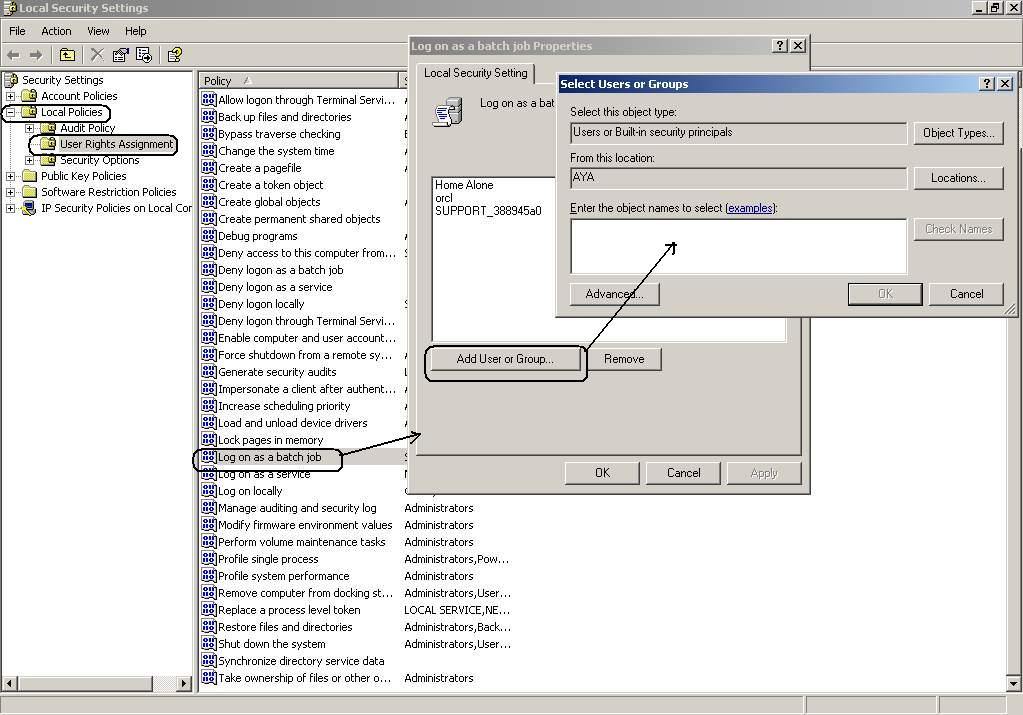 بتاريخ: 21 سبتمبر 200718 سنة comment_110574 فى الجزء الأعلى الخاص بالـ Host Cerdentails سوف تكتب اسم المستخدم الذى دخلت به على ال Operating System و ستكتب ال password الخاصة به و فى حالة أنك تستخدم الـ Windows سيتوجب عليك أن تراجع ثلاث نقاط مهمة لكى تستخدم ال Enterprise Manager فى عمليات ال Startup And Shutdown و عمليات الـ Backup and Recoveryأولا : لابد أن يكون مستخدم ال Windows ضمن مجموعة الـ Administartors فى ال Windowsثانيا : لابد ان يكون مستخدم الـ windows ضمن مجموعة الـ ora_dba فى الـ ً Windowsو هذه الخطوات تتم كالأتىستضغط على My computer بزر الأيمن و تختار Manage ستظهر لك ال computer Manaement و منها اختار Local users and groups و منها اختر groups ثم أضف ال OS User فى مجموعات ال Administrator and ora_dbaراجع الصورة المرفقةثالثا : لابد و أن يحصل على الـ Log on as a batch jobو هذه الخطوة تتم كالأتىمن start ثم Run ثم تكتب الأتى secpol.msc ثم تضغط enter ستظهر لك الـ Window الخاصة بـ Local Security Settings ستختار Local settings و منها ستختار User Rights Assigment و عندما تختارها ستظهر لك على الجهة اليمين مجموعة من ال policies ستختار منها الLog on as a batch job ثم تضيف بها المستخدم الذى تريد أن تجعله يقوم بالعمليات ال Startup And Shutdown و عمليات الـ Backup and Recovery راجع الصورة المرفقهو اذا كنت تستخد الـ Linux فلا تحتاج كل هذا فقط تدخل بالمستخد الذى قام بالـ Installation و منه تستطيع أن تفعل به كل ما تريدو فى الجزء الخاص بمستخدم الـ Oracle سوف تكتب اسم الـ Oracle user الذى سوف تتم من خلاله عمليه الـ Startupو الله المستعانُ تقديم بلاغ