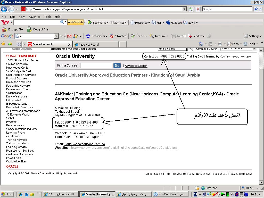 بتاريخ: 10 أكتوبر 200718 سنة comment_112363 اخي هذا الذي وجدته من موقع oracleمرفق الصوره وارقام التلفوناتواليك هذا الرابط فيه مجموعة عناوين في السعوديهوبالتوفيقhttp://www.arabo.com/links/,199,225,211,21...07,209,237,200/ تقديم بلاغ