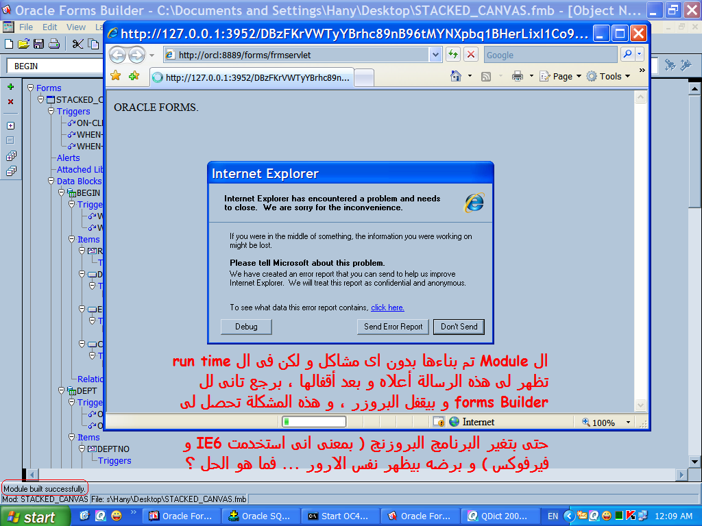 بتاريخ: 28 نوفمبر 200718 سنة comment_117392 انا شغال بال forms 6i و انا ماشى بيه كويس اوىبس واحد صديقى قالى انه هو منزل فورمز ال 6i وال 10g و هما الاتنين شغلين عادى بدون اى مشاكلفرحت انا نزلت ال 10g ....... هو اشتغل عادى ماعدا ال Run timeال Module تم بناءها فى ال 10g بدون اى مشاكل و لكن فى ال run time تظهر لى هذه الرسالة اللى فى الصورة المرفقة و بعد أقفالها ، برجع تانى لل forms Builder و بيقفل البروزر . و هذه المشكلة تحصل لى حتى بتغير البرنامج البروزنج ( بمعنى انى استخدمت IE6 و فيرفوكس ) و برضه بيظهر نفس الارور ... فما هو الحل ؟ تقديم بلاغ
