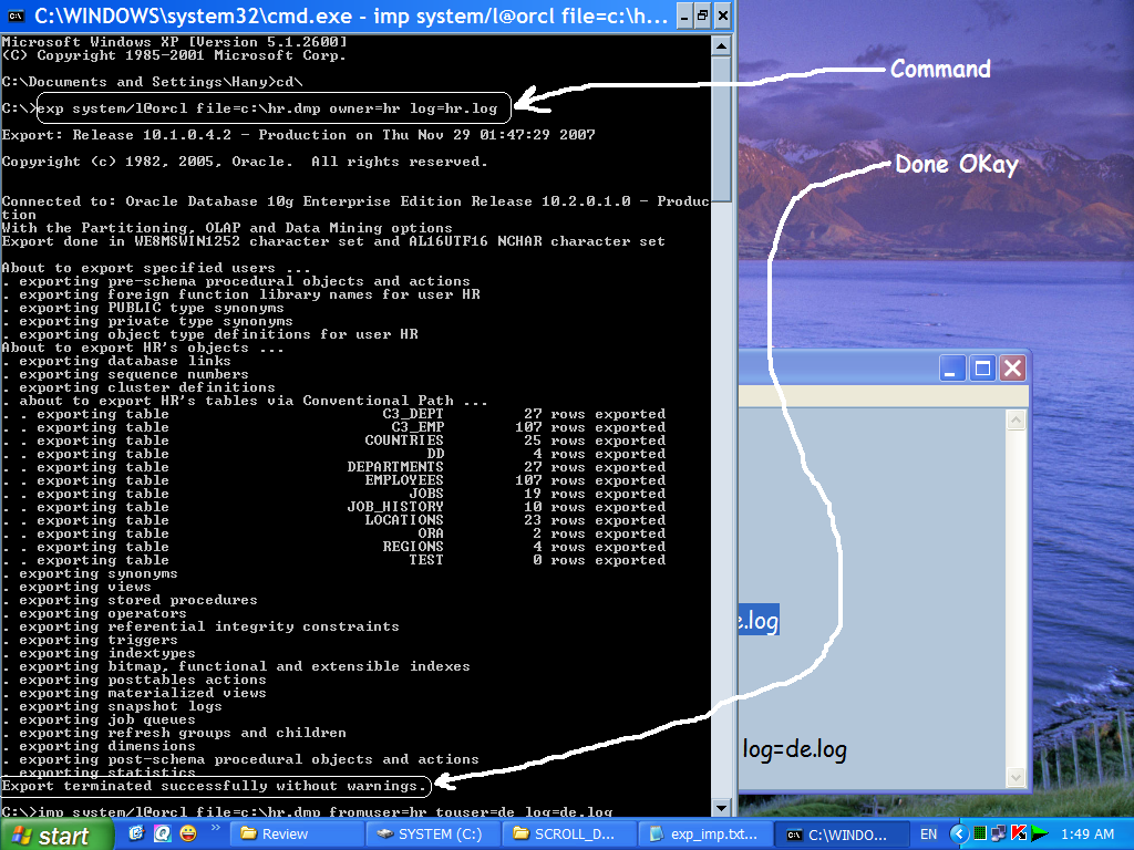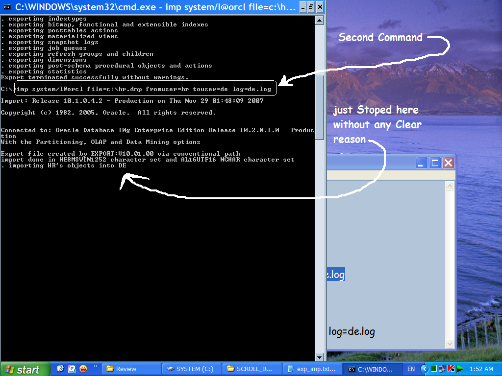 بتاريخ: 29 نوفمبر 200718 سنة comment_117396 انا قمت بنشأ أسكيمة ال de التى اريدها ان تحوى كل ما بداخل اسكيمة ال hr وال scott create user de identified by l; grant dba to de; grant create table to de; exp system/l@orcl file=c:\hr.dmp owner=hr log=hr.log imp system/l@orcl file=c:\hr.dmp fromuser=hr touser=de log=de.log exp system/l@orcl file=c:\scott.dmp owner=scott log=scott.log imp system/l@orcl file=c:\scott.dmp fromuser=scott touser=de log=de.log و لكن عند تنفيذى للأمر الثانى :- imp system/l@orcl file=c:\hr.dmp fromuser=hr touser=de log=de.log يقف ال CMD عند نقطة معينة و لا يكمل .... كما هو موضح بالصور المرفقة .فما هو السبب فى ذلك ؟و شكراً تقديم بلاغ