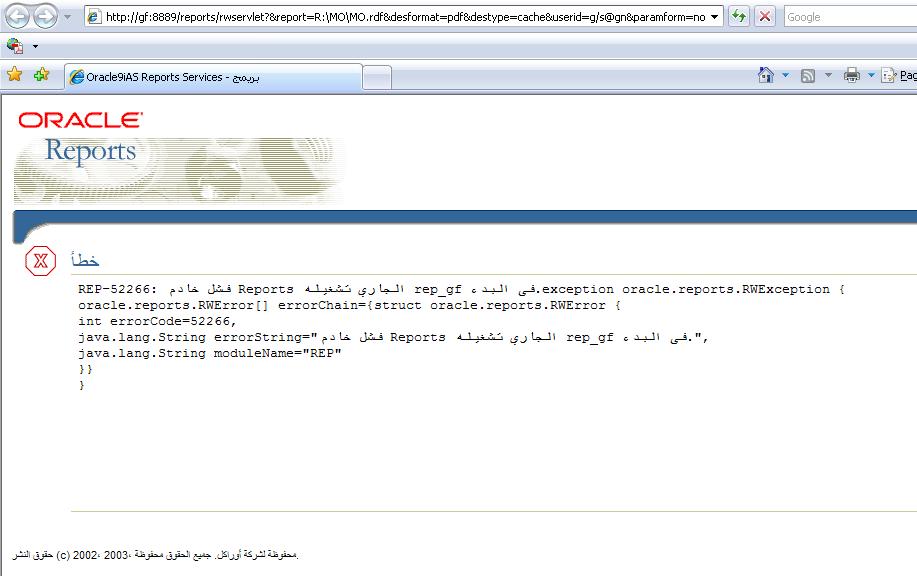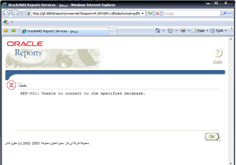 بتاريخ: 25 ديسمبر 200718 سنة comment_119129 اخ عصامقم بالتأكد من صحة اسم قاعدة البيانات الموضوعة . هذه الطريقة شغالة 100% معاي من دون اخطاء للتأك قم بتجربة هذا الكود . هذا الكود يقوم بمناداة التقرير من دون ارسال متغير الى الداتابيز declare rep_url varchar2(2000); begin rep_url:='/reports/rwservlet?&report=c:\pem\student_information_report.rdf' ||'&desformat=pdf&destype=cache&userid=pem/pem@hotmail' ||'¶mform=yes ارجو ان يعملعصام ان شاء الله بكرة ببعتلك نفس الفورمة .بالتوفيق تقديم بلاغ