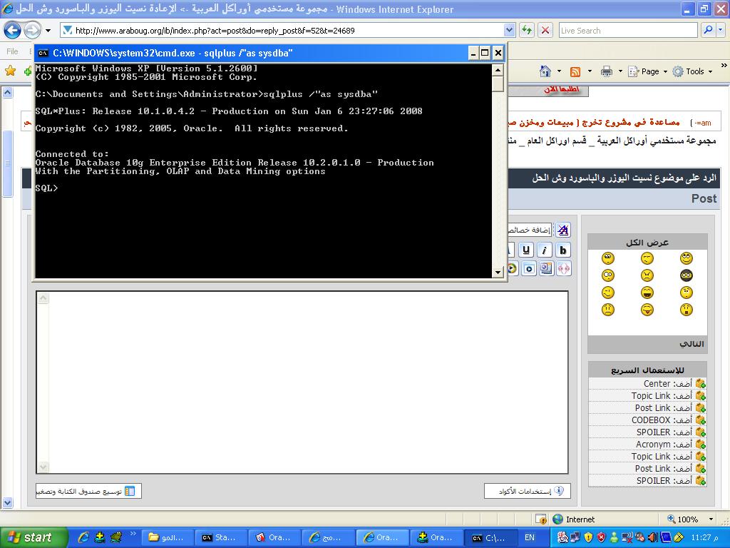 بتاريخ: 6 يناير 200818 سنة comment_119934 حركه خبيثه من مشرف محترف .... واضف على اخى مودى هذه الطريقه ايضا1- افتح قائمة start ثم Run ثم اكتب CMD2- اكتب هذا السطر كما بالصوره المرفقه( انظر الى الصوره المرفقه ) sqlplus /"as sysdba" 3- ابدأ بكتابه اى تعديل على اى مستخدم فأنت الأن بمثابه ال DBA و شكرا يا اوراكل تقديم بلاغ