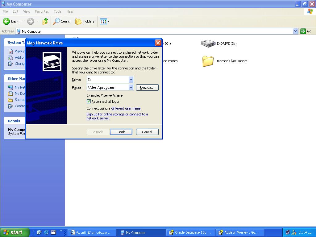 بتاريخ: 22 سبتمبر 200421 سنة comment_13125 To make a map Netwrok Drive follow these steps1- we assume that ur sever name is "test" and ur fmx files is on a shared forlder on the server named "program"2- open My Computer3- from the tools menu select " Map Netwrok Drive ..."4- from the dialog that appear choose the drive name say "Z" and click browse & go to ur shared forlder "program" 5- click finishthe operating system should opens the folder for u know to inform u that u r now had created a map netwrok drive.see the attached picture. تقديم بلاغ