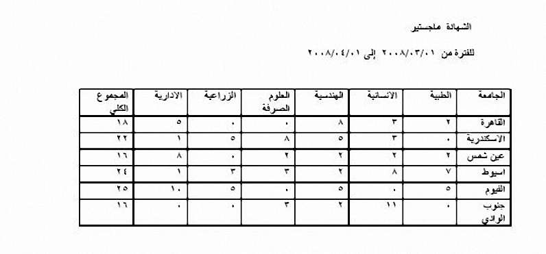 بتاريخ: 3 أبريل 200818 سنة comment_125964 استخدم فكرة المصفوفه فى انشاء التقرير matrix report من خلال المساعدة بالتقرير wizard حدد المحور الطولى على عمود الجامعهوحدد المحور الافقى على عمود التخصص واستخدم خاصية التجميع للسجلات .. لكى تظهر المجاميع على مستوى كل خلية هذا هو جسم التقرير قبل ذلك حدد الgroup مستقل على مستوى عمود نوع الدراسة ( ماجستير او دكتوراه ) بحيث ان كل نوع سيكون فى صفحة مستقلة ( تلقائيا حسب البيانات الموجودة بالجدول ) ثم سيتم توزيع باقى الاعمدة على المجموعات الاخرى طبقا لرسمة ال matrix المحددة عند استخدام ال wizard فى تكوين التقرير وبالطبع ستستخدم مؤشرات التقرير بحيث يتم ادخال الفترة المطلوبه لتنفيذ التقرير ... التاريخ من ... التاريخ الى تقديم بلاغ