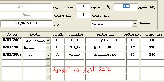 بتاريخ: 16 أبريل 200817 سنة comment_126844 بسم الله الرحمن الرحيميا اخواني الاعزاء التقرير هذا اتعبني واتمنى ان اجد راحتي عندكمانا سويت برنامج لمتابعة المندوبين في زيارات الاطباءيعني مندوب1 من زار يوم كذا ومندوب 2 من زار يوم كذا من خلال تقارير يحضرونها يومياعندي الان عدة تقارير تطلع الزيارات وتطلع كافة البيانات والبرنامج شغال زي الحلاوةبس الان لي قرابة شهر وانا اصلح تقرير بس بدون فايدةانا عاوز اسوي تقرير يطلع الاطباء الي ما انزارو في بين تاريخينيعني اشتي اسوي تقرير يطلع جميع الاطباء الي ما انزارو من تاريخ 1/1/2008 الى تاريخ 1/2/2008لاكن بدون فايدهانا ارفقت لكم شاشة ادخال بيانات الاطباء وشاشة ادخال بيانات الزيارات اليوميةعشان حد منكم يعطيني فكرة او حل او تعديل عشان التقرير يشتغل واخلص منهولكم في الاخير مني جزيل الشكر والتقديروجزاكم الله كل خير تقديم بلاغ
