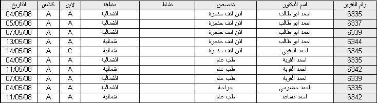 بتاريخ: 15 مايو 200817 سنة comment_128910 اخي الكريم / بدايتا الرجاء التكرم بعدم تكرار الموضوع اكثر من مرة , عدم تجاوب الاخوة يدل على انشغالهم الشديدوصدقني اول فرصة تتاح لهم على الفور ستجد الرد من قبلهم .بالنسبة للتقرير الذي عملته المشكلة ابتداءا تكمن في نوع التقرير , وحسب الذي فهمته يحب ان يكون تقريركMASTER - DETAILSبحيث يتم عرض اسم الدكتور والتخصص في الماستر وباقي البيانات في الديتالز مما يسمح بعدم تكرار اسم الدكتور .وتستطيع عمل مجموع لرقم التقرير على مستوى الديتالز لتعرف عدد الزيارات بحيث انك تعرض التفاصيل الخاصةبكل دكتور وفي النهاية تعطي عدد الزيارات الخاصة بكل دكتور .ارجو ان تكون الصورة واضحة . تقديم بلاغ