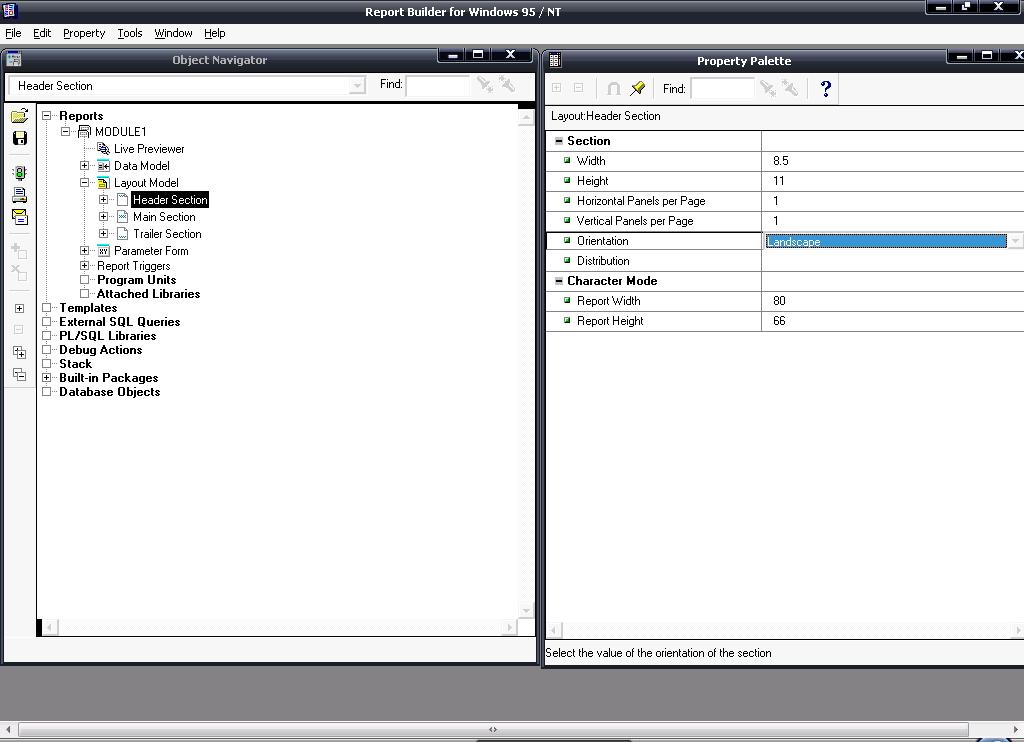 بتاريخ: 22 مايو 200817 سنة comment_129401 اخي الفاضل لطباعة التقرير بشكل افقي من object navigator تذهب الى layout Model يوجد ثلاثة section من خصائصهم تعكس قيمة Width مكان Heigth وتعمل Orientation --- Landscape ثم نذهي الى data Model و نختار system parameters ثم خصائص Orientation ونجعل القيمة الإفتراضية Landscape واليك هذه الصورةاتمنى ان اكون افدك ودمت بود....... تقديم بلاغ