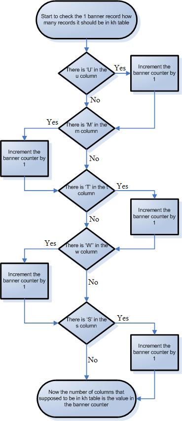 بتاريخ: 24 يوليو 200817 سنة كاتب الموضوع comment_133995 شكـــــــــــــــــرا كتير كتير كتير ع الرد المميز ... كتير استفدت من الكود اللي بعتلي اياه انا حبيت احط المشكلة بالتفصيل مع حلها مشان اي حد تاني يستفيد ان شا الله بداية ... عندي جدولين ... بدي اقارن الrecords فيهمواطلع السجلات الناقصة ... وبس اعرضها بال outputهو الصعوبة بالموضوع انو ممكن سجل جوا ال banner يماثل من سجل لخمسة جوا ال khحسب الايام ... هي طريقة ضعيفة لانشاء جدول .. انما الجدول موجود جاهز وعلينا نتعايش معهاول خطوة ... بدي اعمل الجدولين على SQL create table banner( term_code varchar2(10), crn varchar2(10), building varchar2(6), room varchar2(6), start_time number(4)not null, end_time number(4)not null, u varchar2(1), m varchar2(1), t varchar2(1), w varchar2(1), s varchar2(1), primary key(term_code,crn,building,room,start_time,end_time)) ; create table kh( term_code varchar2(10), crn varchar2(10), building varchar2(6), room varchar2(6), start_time number(4)not null, end_time number(4)not null, weekday number(1)not null, primary key(term_code,crn,building,room,start_time,end_time,weekday)); تاني خطوة ... بندخل بيانات جواتهم .. بصير شكلهم كالتاليTERM_CODE CRN BUILDI ROOM START_TIME END_TIME U M T W S---------- ---------- ------ ------ ---------- ---------- - - - - -200910 10003 MQ17 104 900 1215 U T200910 10003 MQ12 104 800 9000 U T200910 12345 MQ23 123 1100 1250 M W200910 12099 MQ23 103 800 900 STERM_CODE CRN BUILDI ROOM START_TIME END_TIME WEEKDAY---------- ---------- ------ ------ ---------- ---------- ----------200910 10003 MQ17 104 900 1215 1200910 10003 MQ17 104 900 1215 2200910 12099 MQ23 103 800 900 5200910 10003 MQ12 104 800 9000 2200910 10003 MQ12 104 800 9000 4200910 12099 MQ23 M103 800 900 1واخر خطوة هي pl sql declare /*declare the counters for banner and for kh */ kh_counter number := default Null; banner_counter number(3); /* declare banner cursor */ cursor banner_cur is select * from banner where term_code= '200910'; /* declare banner record */ banner_rec banner_cur%ROWTYPE; /* declare kh cursor which is a cursor with parameter */ cursor kh_cur (p_term_code varchar2, p_crn varchar2, p_building varchar2, p_start_time number, p_end_time number) is select * from kh where term_code= p_term_code and crn= p_crn and building = p_building and start_time = p_start_time and end_time= p_end_time; /* declare kh record */ kh_rec kh_cur%ROWTYPE; BEGIN DBMS_output.PUT_LINE('Lets start'); /* open the banner cursor if its not already opened */ IF NOT banner_cur%ISOPEN THEN open banner_cur; END IF; /* fetch the banner cursor into the banner record and then start the loop */ loop FETCH banner_cur INTO banner_rec; EXIT WHEN banner_cur%NOTFOUND; /* we want to know that this record how many record it will present in kh table depending on the days the we store this value in the banner_counter*/ banner_counter := 0; /* intialize the counter to zerp */ IF banner_rec.u = 'U' /* if the value is null then it will be treated as false*/ Then :banner_counter := banner_counter +1 ; END IF; IF banner_rec.m = 'M' Then :banner_counter := banner_counter +1 ; END IF; IF banner_rec.t = 'T' Then :banner_counter := banner_counter +1 ; END IF; IF banner_rec.w = 'W' Then :banner_counter := banner_counter +1 ; END IF; IF banner_rec.s = 'S' Then :banner_counter := banner_counter +1 ; END IF; /* open the kh cursor and passing it's argument from banner record to make sure we have the same records in the ACTIVE SET to the current record in banner */ open kh_cur (banner_rec.term_code, banner_rec.crn, banner_rec.building, banner_rec.start_time, banner_rec.end_time); /*intialize the kh counter for the match records to zero then we will start a counter to fetch all the records in the active set till the active set is empty and the number of records are stored int he kh_counter*/ kh_counter := 0; loop FETCH kh_cur INTO kh_rec; EXIT WHEN kh_cur%NotFOUND; :kh_counter := kh_counter +1 ; END LOOP; close kh_cur; /* now 2 check for missing record all what we need to do is to compare the two counters value */ IF banner_counter > kh_counter THEN DBMS_output.PUT_LINE( 'The CRN = ' || banner_rec.crn ||'have missing record/records in khadamat table '); END IF; END LOOP; CLOSE banner_cur; END; ارفقت صورتين لتوضيح طريقة عمل الكود .... اي سؤال او استفسار انا جاهزة ومرة تانية ... شكرا لكل اللي رد على سؤالي نـــــــــــــــــور تقديم بلاغ