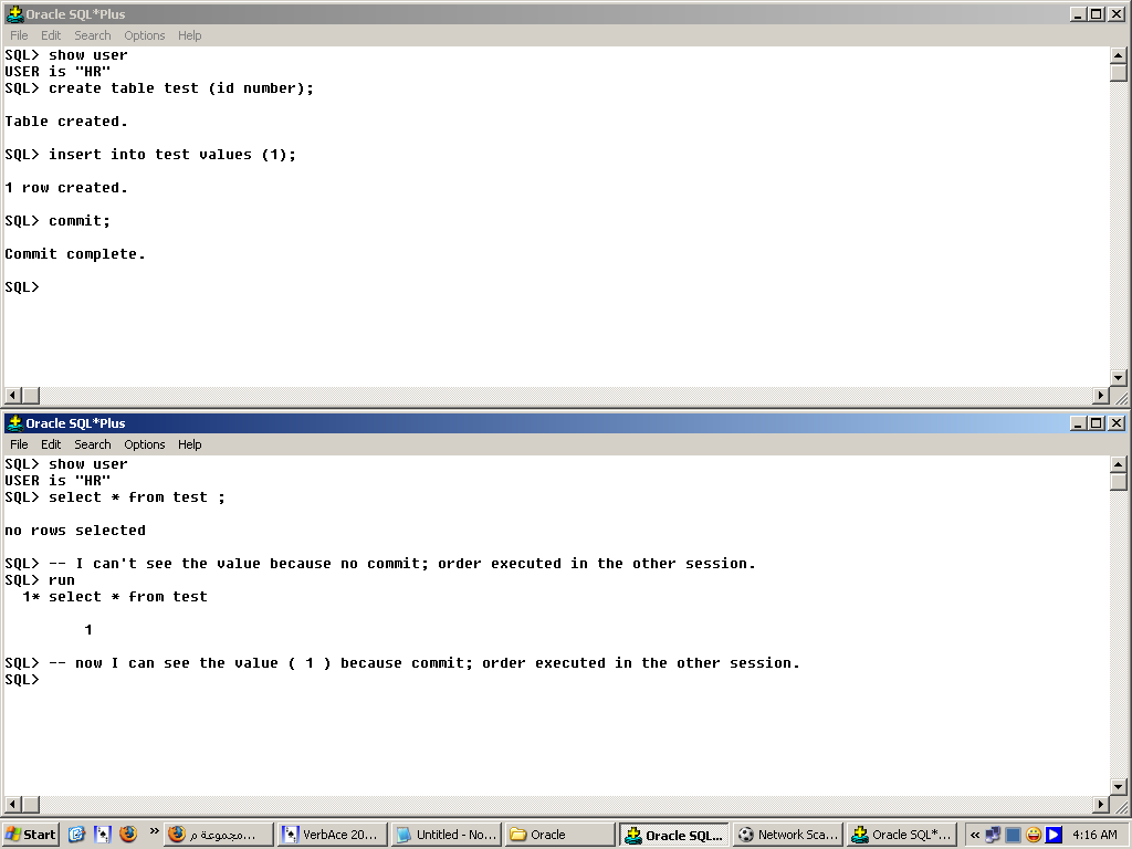 بتاريخ: 26 يوليو 200817 سنة comment_134106 التعريف موجود على موقع اوراكل الرسمى :- http://www.oracle.com/glossary/sa_so.html و هو بيقول ان الأسكيمة ( Schema ) عبارة عن :- A collection of related database objects including tables, views, and other objects اى ان الاسكيمة عبارة عن مجموعة مترابطة من كائنات قاعدة البيانات ذى الجداول و المناظر ( الفيو view ) و كائنات اخرى .و انا اضيف و اقول انت لما تيجى تدخل على اى user بامر connect و تكتب بعد كده ال user name وال password ، فانت كده بتدخل على الاسكيمة .أما ال session فهى الفترة اللى انت فاتح فيها الاداة اللى بتوصلك بقاعدة البيانات ذى ال SQL*PLUS , TOAD , ISQL*PLUS و غيرهم ، و هنا احنا مش بنقصد الوقت بس لكن بنقصد برضه اوامر السكويل بتاعة ال DML و اوامر البيئة ( اللى هى ذى set serveroutput on , set time on ...... و غيره ) . بمعنى :-ادخل على اسكيمة ال HR و اكتب الامر ده :- SET HEAD OFF و بعد كده اكتب كود استرجاع اى بيانات ذى :- select * from employees ; هتلاقى ال head مش موجود ( اللى هو فى الحالة دى مفروض يكون ال salary , email و باقى اسماء الاعمدة )اكتب دلوقتى :- connect scott/tiger خلى بالك انت كده دخلت على اسكيمة ال scott من غير ما تقفل البيئة ( ال SQL*PLUS ) اكتب كود استرجاع بيانات اخر :- SELECT * FROM emp ; هتلاقى ان ال head برضه مش طالعه يعنى اسماء الاعمدة مش ظاهرة .لكن لو انت مكنتش عملت ال connect scott/tiger و رحت ساعتها قفلت ال sql*plus و فتحته على اسكيمة ال scott ، كده انت كأنك قفلت session و فتحت session جديد و بتالى اسماء الاعمدة كانت هتظهر عادى .فى نقطتان تانى بخصوص ال session و هو فتح اكثر من session فى نفس الوقت .النقطة الاولى :-افتح ال SQL*PLUS مرتين ، فى المرة الاولى خليه على اسكيمة ال SYSTEM و المرة التانية خليه على اسكيمة ال HRلما نيجى نمسح اسكيمة ال HR - و ده طبعاً لازم فى اى حال من الاحوال يتم على اسكيمة ال SYSTEM لأنها هى اللى ليها صلاحية مسح الأسكيمات الاخرى ( أنا بتكلم هنا على الوضع الافتراضى دون التطرق لأحاديث ال Grant و ال Revoke ) - فهنفذ هنا الكود ده :- DROP USER HR CASCADE; هتلاقى فى رسالة خطاء ظهرت و هى :- ORA-01940: cannot drop a user that is currently connected و ده معناه ان اسكيمة ال HR على session اخر و من ثم لا يمكن مسحها ، ألا عندم يتم قفل ال session اللى هى عليه ..... حمل الصورة المرفقة 2SESSIONS.PNG لزيادة التوضيح .النقطة الثانية :-أوامر ال DML لا ترى من session لأخر ، ألا عند عمل commit ...... حمل ملف ال commit.PNG لزيادة التوضيح .بالنسبة لتعريف ال session فى موقع الاوراكل فهو تعريف دقيق للغاية و مختصر مما يصعب فهمه علشان كده انا كتبت الشرح السابق علشان تفهم ما المقصود بال session بصفة عامة .تعريف موقع الاوراكل لل session هو :- In Java, an object used by a servlet to track a user's interaction with a Web application across multiple HTTP requests اتمنى ان تكون الفكرة وصلتك .و بالتوفيق تقديم بلاغ