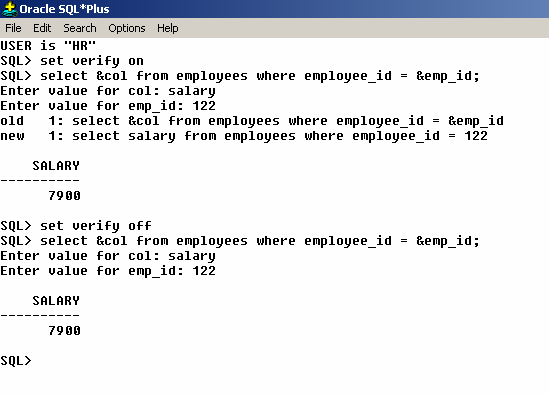 بتاريخ: 7 أغسطس 200817 سنة comment_135442 معلش يا أستاذ هاني متهيألي هو بيقصد تعديل خاصيه من خصائص بيئة ال SQL*PluS وهو Verify :عموماً يمكن تغيير خاصية ال Verify عن طريق الأمر set verify on أو set verify off وهذه الخاصيه تستخدم للطباعة على سبيل المثال لطباعة سطر يوجد به قيم المتغيرات عند إستخدام ال Substitution Variablesفإذا كنا نريد عرض قيم المتغيرات فإننا نستخدم الأمرset verify onو بالتال بعد تنفيذ أمر السيكول الموجود به ال Substitution Variables فسوف يتم كتابة قيمة المتغيرات القديمه و الجديده بعد التعويض.على سبيل المثال سوف يتم كتابة:old : employee_id = &employee_ numnew: employee_id = 101 تقديم بلاغ