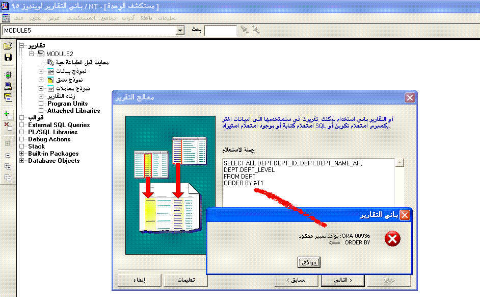 بتاريخ: 8 نوفمبر 200817 سنة كاتب الموضوع comment_142590 الأخوة الكرام /رجائي مساعدتي لحل مشكلة ارسال باراميتر لـ Order By في تعليمة Sql في التقرير .حيث تظهر لي الرسالة التالية : ( تجدونها في الصور ادناه )أرجو المساعدة العاجلة .... علما أنني استخدم Oracle Report 6i with patch 17 تقديم بلاغ
