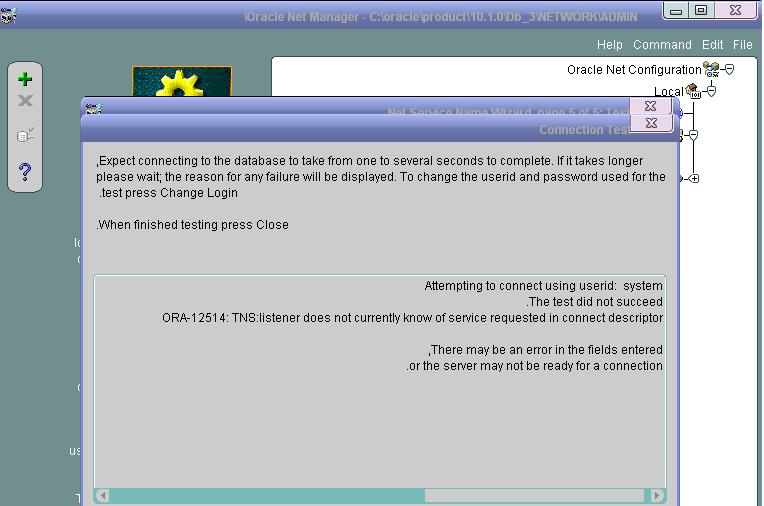 بتاريخ: 21 ديسمبر 200817 سنة comment_145174 1.check if listener is up and running 2.try to relate the service with listener using net manager1-Net Manager > local > Listeners > Listener > Change 'Listening Location' to 'Database Services' Add Databse > provide Global DB Name / Oracle Home / SID Press File Menu > Save Network Configuration -Restart the Listener 3- Connect using any of the following forms sqlplus / as sysdba sqlplus sys/sys as sysdba sqlplus sys/sys@orcl as sysdba تقديم بلاغ