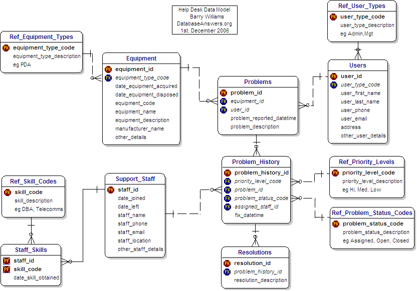 بتاريخ: 26 مارس 200917 سنة comment_152245 السلام عليكم ورحمة الله رسمة ال ER تتكون من وحدات البيانات التالية :1-البيانات الاساسية لمستخدمى النظام users2-رموز لانواع المستخدم user-types ( مثل مدير - مسئول - ) 3-الاجهزة والمعدات equipment4- رموز انواع المعدات equipment_ types 5-بيانات موظفى الدعم الفنى support_staff6- مهارات موظفى الدعم الفني staff- skills 7-رموز انواع المهارات skill-codes8- المشاكل المطلوب حلها والمقدمة من المستخدمين problems9- تكليفات الفنيين لحل المشاكل problem history 10- رموز مستوى الاولوية فى حل المشكلة priority level ( اولوية عالية فى حل المشكلة - متوسط - اقل - ... )11- رموز للحالة الخاصة بالمشكلة problem status code مثل ( مشكلة جديدة - تم حل المشكلة - فى مرحلة الاصلاح -)12 - وصف حل المشكلة resolutionفكرة الhelp disk هى استلام المشاكل الفنية من المستخدمين او المديرين وتوزيعها على موظفى الدعم الفنى طبقا لمهاراتهم وخبرتهم فى حل المشاكل ... والمشاكل يتم تحديد درجة اهميتها واولويتها فى الاصلاح مع ذكر شرح لطبيعة المشكلة وكيفية حلها .العلاقات بين الجداول المستخدم و نوع المستخدم 1:m- كل مستخدم يجب ان يكون تابع لوظيفة معينة او نوع معين ( مدير - مسؤول عن النظام - رئيس قسم - ... ) - الوظيفة يمكن ان تحدد لمستخدم واحد أو أكثر المعدات وانواعها 1:m- كل معدة او جهاز يجب ان يكون له نوع - نوع المعدة او الجهاز يمكن ان يحص جهاز واحد او اكثر - الموظفينsupport_staff والمهارات skill-codes هى علاقة M:M لذلك يجب انشاء جدول ثالث يربط بين الجدولين وهو مهارات الموظف staff- skillsوهذا الجدول الجديد الثالث ... يكون مفتاح الجدول Primary key مكون من عمودين ... العمود الاول هو مفتاح جدول الموظفينوالعمود الثاني هو مفتاح جدول رموز المهارات اى ان الموظف محمد احمد قد يكون لدية مهام التركيب وايضا الموظف محمد احمد لدية مهام صيانة اجهزة من نوع اوموظف اخر قد يكون له اكثر من مهام يستطيع تأديتها ونفس المهمه يمكن تأديتها بموظف واحد أو أكثر - جدول المشاكل و المستخدمين 1:m - المستخدم يمكن ان يتقدم بأكثر من مشكلة - لا يمكن وجود مشكلة بدون ان يقدمها مستخدم جدول المشاكل والمعدات 1:M- المشكلة يجب ان تكون مرتبطة بجهاز - نوع الجهاز يمكن ان يكون علية أكثر من مشكلة وايضا جدول حلول المشاكل مع المشاكل 1 :mالمشكلة الواحدة يمكن ان يكون لها اكثر من حل او تعامل معها - لا توجد حلول بدون وجود مشكلة تقديم بلاغ