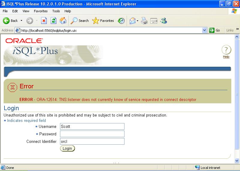بتاريخ: 8 يونيو 200916 سنة comment_159741 عندما أقوم بمحاولة ال log in على شاشة ال Sql فى المتصفح الخاص بىوبعد كتابة المستخدم وكلمة السر وإسم قاعدة البيانات تظهر هذه الرسالهERROR - ORA-12514: TNS:listener does not currently know of service requested in connect descriptor ولا يتم الدخول لقاعدة البياناتنرجوا حل هذه المشكلهولكم جزيل الشكر تقديم بلاغ