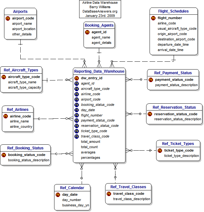 بتاريخ: 12 يوليو 200916 سنة comment_162882 السلام عليكم ورحمة الله بالاضافة الى ملاحظات الأخوه الاعضاء من حيث الالتزام بصحة كتابة اوامر انشاء الجداول يفضل ان تستخدم احد البرامج المساعدة فى انشاء الجداول والعلاقات بينها وهى موجودة فى قسم البرامج المساعدة منها ال power designer - sql developer create table Airports ( airport_code NUMBER(10) not null, airport_name VARCHAR2(20), airport_location VARCHAR2(20), other_details VARCHAR2(40), constraint PK_AIRPORTS primary key (airport_code) ); create table Booking_Agents ( agent_id NUMBER(10) not null, agent_name VARCHAR2(20), agent_details VARCHAR2(30), constraint PK_BOOKING_AGENTS primary key (agent_id) ); create table Flight_Schedules ( flight_number NUMBER(10) not null, airline_code NUMBER(10), usual_aircraft_typ_code NUMBER(10), origin_airport_code NUMBER(10), destination_airport_code NUMBER(10), departure_data_time TIMESTAMP, arrival_data_time TIMESTAMP, constraint PK_FLIGHT_SCHEDULES primary key (flight_number) ); create table Ref_Aircraft_Types ( aircraft_type_code NUMBER(10) not null, aircraft_type_name VARCHAR2(20), aircraft_type_capacity VARCHAR2(20), constraint PK_REF_AIRCRAFT_TYPES primary key (aircraft_type_code) ); create table Ref_Airlines ( airlines_code NUMBER(10) not null, airlines_name VARCHAR2(20), airlines_country VARCHAR2(20), constraint PK_REF_AIRLINES primary key (airlines_code) ); create table Ref_BOOKING_STATUS ( booking_status_code NUMBER(10) not null, bookimg_status_desription VARCHAR2(20), constraint PK_REF_BOOKING_STATUS primary key (booking_status_code) ); create table Ref_Calendar ( day_date date not null, day_number NUMBER(10), business_day_yn NUMBER(10), constraint PK_REF_CALENDAR primary key (day_date) ); create table Ref_Payment_Status ( payment_status_code NUMBER(10) not null, payment_status_description VARCHAR2(20), constraint PK_REF_PAYMENT_STATUS primary key (payment_status_code) ); create table Ref_Reservation_Status ( reservation_status_code NUMBER(10) not null, reservation_status_description VARCHAR2(20), constraint PK_REF_RESERVATION_STATUS primary key (reservation_status_code) ); create table Ref_Ticket_Types ( ticket_type_code NUMBER(10) not null, ticket_type_description VARCHAR2(20), constraint PK_REF_TICKET_TYPES primary key (ticket_type_code) ); create table Ref_Travel_Classes ( travel_class_code NUMBER(10) not null, travel_class_description VARCHAR2(20), constraint PK_REF_TRAVEL_CLASSES primary key (travel_class_code) ); create table Reporting_Data_Warehouse ( dw_entry_id NUMBER(10) not null, agent_id NUMBER(10) not null, aircraft_type_code NUMBER(10) not null, airlines_code NUMBER(10), airport_code NUMBER(10) not null, booking_status_code NUMBER(10), day_date date, flight_number NUMBER(10) not null, payment_status_code NUMBER(10), reservation_status_code NUMBER(10), Ref_ticket_type_code NUMBER(10), travel_class_code NUMBER(10), total_amount NUMBER(10,2), total_count NUMBER(10), averages NUMBER(10), percentages NUMBER(10), constraint PK_REPORTING_DATA_WAREHOUSE primary key (dw_entry_id) ); alter table Reporting_Data_Warehouse add constraint FK_REPORTIN_REFERENCE_BOOKING_ foreign key (agent_id) references Booking_Agents (agent_id); alter table Reporting_Data_Warehouse add constraint FK_REPORTIN_REFERENCE_REF_TICK foreign key (Ref_ticket_type_code) references Ref_Ticket_Types (ticket_type_code); alter table Reporting_Data_Warehouse add constraint FK_REPORTIN_REFERENCE_REF_TRAV foreign key (travel_class_code) references Ref_Travel_Classes (travel_class_code); alter table Reporting_Data_Warehouse add constraint FK_REPORTIN_REFERENCE_REF_AIRC foreign key (aircraft_type_code) references Ref_Aircraft_Types (aircraft_type_code); alter table Reporting_Data_Warehouse add constraint FK_REPORTIN_REFERENCE_REF_AIRL foreign key (airlines_code) references Ref_Airlines (airlines_code); alter table Reporting_Data_Warehouse add constraint FK_REPORTIN_REFERENCE_AIRPORTS foreign key (airport_code) references Airports (airport_code); alter table Reporting_Data_Warehouse add constraint FK_REPORTIN_REFERENCE_REF_BOOK foreign key (booking_status_code) references Ref_BOOKING_STATUS (booking_status_code); alter table Reporting_Data_Warehouse add constraint FK_REPORTIN_REFERENCE_REF_CALE foreign key (day_date) references Ref_Calendar (day_date); alter table Reporting_Data_Warehouse add constraint FK_REPORTIN_REFERENCE_FLIGHT_S foreign key (flight_number) references Flight_Schedules (flight_number); alter table Reporting_Data_Warehouse add constraint FK_REPORTIN_REFERENCE_REF_PAYM foreign key (payment_status_code) references Ref_Payment_Status (payment_status_code); alter table Reporting_Data_Warehouse add constraint FK_REPORTIN_REFERENCE_REF_RESE foreign key (reservation_status_code) references Ref_Reservation_Status (reservation_status_code); تقديم بلاغ