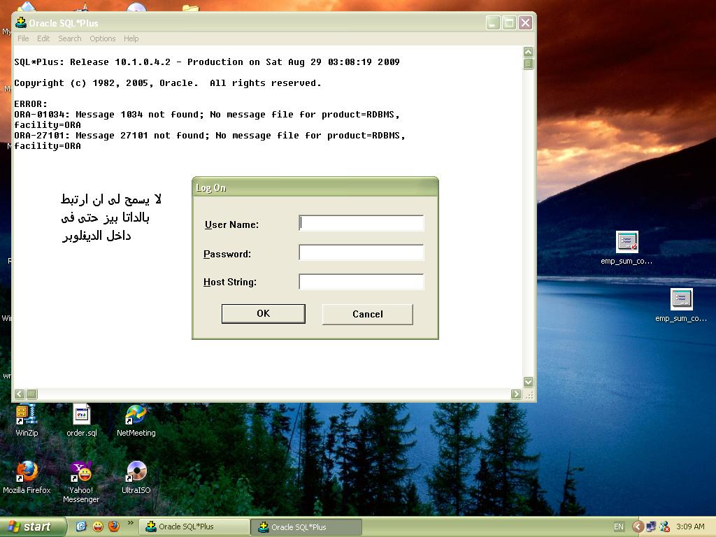 بتاريخ: 31 أغسطس 200916 سنة comment_168298 جرب 1- تشوف السيرفس بتاع الأوراكل شغاله ولا لا يعني ال LISTINER ودي هتلاقيها موجوده في الADMINSTRATIVE TOOLES اللي موجوده في الCONTROOLE PANAL هتلاقي حاجه اسمها الSERVICES شوف ORACLE LISTINER SERVICES شغاله ولا لا ولو مش شغاله قم بتشغيلها2- غير اسم جهاز الكمبيوتر بتاعك باسم الداتابيز بتاعتك عشان يأخده ك HOST للداتابيز تقديم بلاغ