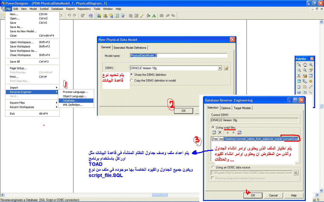 بتاريخ: 23 فبراير 201016 سنة comment_185704 السلام عليكم ورحمة الله يمكنك استخدام طريقة اخرى بدلا من الربط مع قاعدة البيانات يمكنك التعامل مع ملف ال script file الذى يحتوى اوامر انشاء الجداول والقيود الموجودة على الجداول واوامر الربط بين الجداول ... ويمكن استخراج هذا الملف من خلال استخدام برنامج ال TOAD بعد الربط مع قاعدة البيانات "اوراكل" بعد ان تحصل على هذا الملف ... يمكنك اتباع الخطوات الموجودة بالصورة المرفقه وبعد تنفيذ هذه الخطوات سيظهر لك رسمة ال erd or pdm للجداول والعلاقات بينها ... ويمكن بعد ذلك استخدام برنامج الPower designer فى استخراج التقارير والتوثيقوالله الموفق تقديم بلاغ