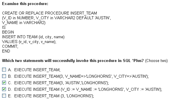 بتاريخ: 12 نوفمبر 200916 سنة comment_176348 الاجابه الصحيحه b and cفي اول Chapter في ال program unite هتلاقى قواعد عمل passing parametersممكن تستخدم طريقه positional يعنى تضع كل متغير على حسب مكانه يعنى الاول ال Id ثم v_city ثم v_nameاو عن طريق name وبتستخدم ال operator =>وتالت طريقه combinationودى بتجمع بين الطريقتين بس اول parameter لازم تستدعيه عن طريق position والباقى عادى بأي طريقه من الاتنينوسؤالك الرابع نفس الفكرهودى امثله من الماتريل CREATE OR REPLACE PROCEDURE add_dept( name IN departments.department_name%TYPE, loc IN departments.location_id%TYPE) IS BEGIN INSERT INTO departments(department_id, department_name, location_id) VALUES (departments_seq.NEXTVAL, name, loc); END add_dept; Passing by positional notation EXECUTE add_dept ('TRAINING', 2500) Passing by named notation EXECUTE add_dept (loc=>2400, name=>'EDUCATION') تم تعديل 12 نوفمبر 200916 سنة بواسطة sara gamal تقديم بلاغ