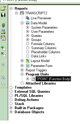 بتاريخ: 8 ديسمبر 200421 سنة comment_20093 احاول ان انزل صورة تعرض المطلوب لكن يحصل خطأ ولا تحمل الصورة اعطني بريدك حتى ارسل لك الصورة تشرح كيف تفتح ال data model بواسطة النقر المزدوج عليها من الشجرة الني تظهر لك التقرير فتفتح لك شاشة ال data model وفي اليسار توجد مجموعة الادوات من ضمن هذه الادوات formula خذها ونزلها في المربع الاصفر الذي يحتوي على اسماء الحقول افتح خصائصها وسوف تجد خاصية pl/sql formula اكتب بها كود التريجر الخاص بك . تقديم بلاغ