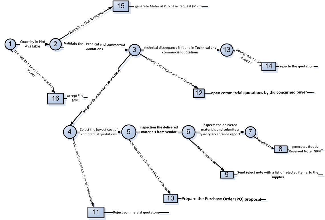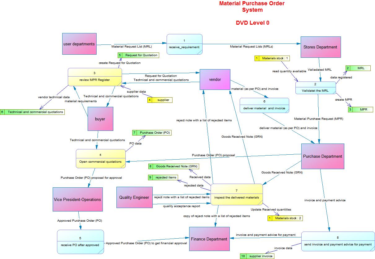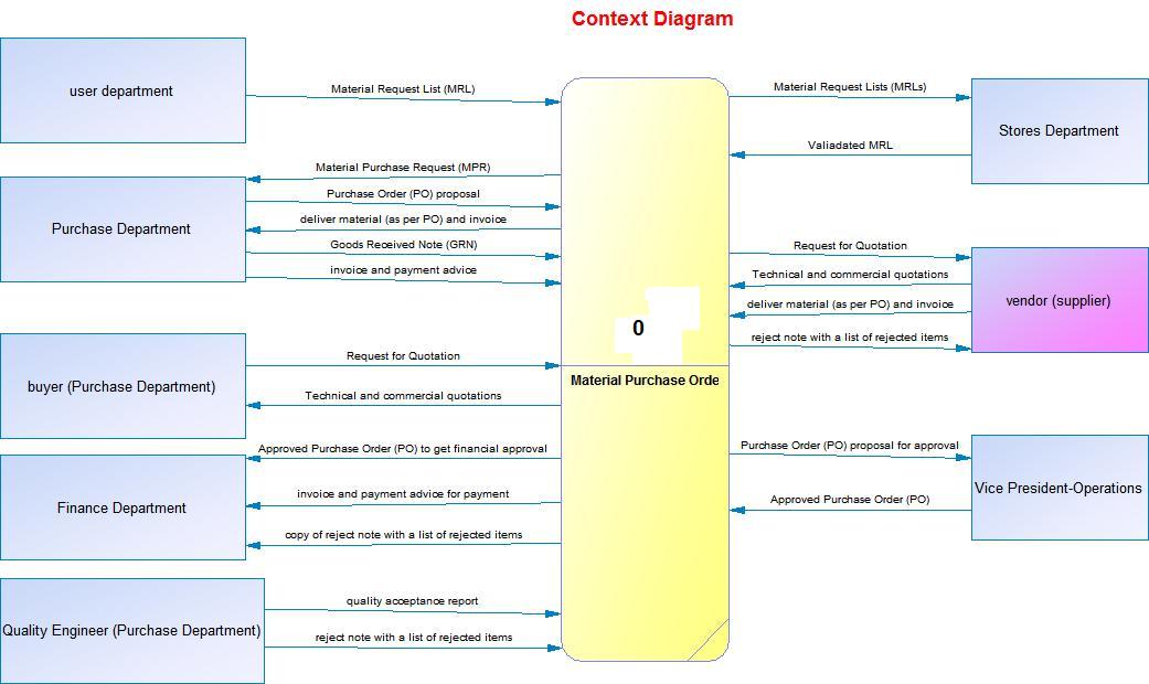 بتاريخ: 3 يناير 201016 سنة comment_181280 اووو تسمحوووا تبدواا ترسمووا من : Functional Details of Purchase ActivityWhenever there is a requirement coming up in user departments (i.e. Production, Maintenance, etc.) they prepare their own Material Request List (MRL). These MRLs are sent to the Stores Department for further processing. More than one material procurement detail can be given in the same MRL.Upon receiving the MRL, Stores Department validates the MRL. Stores Department accepts the MRL only if the required quantity is available in Stores. A Material Purchase Request (MPR) is generated and the compiled MPR request is forwarded to Purchase Department for purchase from supplier.Purchase Department has many groups of clerks who are responsible for purchasing different types of materials. Each group is headed by a clerk named as buyer. Whenever a buyer who handles a particular material group gets time, he reviews MPR Register and consolidates (from various MPRs) material requirement for his groups. After this exercise, he raises an enquiry (Request for Quotation) with registered vendors (vendors are registered with the company for specific class of items). Every enquiry raised has only one closing date (i.e. last date of receipt of quotation from vendors). Technical and commercial quotations are submitted by vendors. A quotation is rejected if any technical discrepancy is found. A quotation which contains discrepancy is rejected after closing date for an enquiry. All commercial quotations received are opened by the concerned buyer (in presence of Purchase Manager and Vendors). Afterwards, all quotations are analyzed for total value (basic cost of materials, taxes, Insurance packing freight). Cost is the main criterion for selection of quotation. On lowest cost basis an offer is selected and Purchase Order (PO) proposal is prepared by Purchase Department.A PO proposal contains details of all materials, payment terms and all other relevant terms and conditions. This PO proposal is sent to Vice President-Operations for approval. Once the approval is received from Vice President-Operations, the PO is further forwarded to Finance Department to get financial approval. Sometimes in the organization’s interest, for an enquiry more than one PO are placed (For example, out of four materials involved in an enquiry, two are cheaper from one vendor and rests are cheaper from another vendor). In a PO every material ordered has a due date for delivery (lead time). Also in some POs, where quantity ordered is large (this situation is typical for bulk material procurement, engine oil, steel etc.) staggered delivery of material is mentioned. PO is considered effective from the date of acceptance of PO by vendors. Vendors deliver material (as per PO) and invoice to Purchase Department. The Quality Engineer from Purchase Department inspects the delivered materials as per the company quality standards and submits a quality acceptance report. On receiving of "Acceptance" intimation from Quality Engineer, Purchase Departments generates Goods Received Note (GRN). Furthermore, Purchase Department passes the invoice and payment advice to Finance Department for payment. A reject note with a list of rejected items are prepared by Quality Engineer and sent to the supplier with a copy to Finance Department. Finance Department makes payment to the supplier. In case of any discrepancy in the terms & conditions such invoice is rejected. Based on the above narration, do the following tasks:1. Construct the following for the above mentioned scenarioa. Context diagramb. Level 0 DFDc. Level 1 DFD of any process identified in Level 0d. Decision Tree or Structured English[ محتاجينه ضروري خاصه لفل 1 و 0 تقديم بلاغ