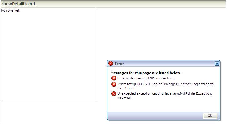 بتاريخ: 6 يناير 201016 سنة comment_181620 I made a simple jspx page using jdeveloper11g and ADFthe page display the customer informationI connect to SQL server databasewhen testing the connection the test success but when running the application form JDEVELOPER I have this error تقديم بلاغ