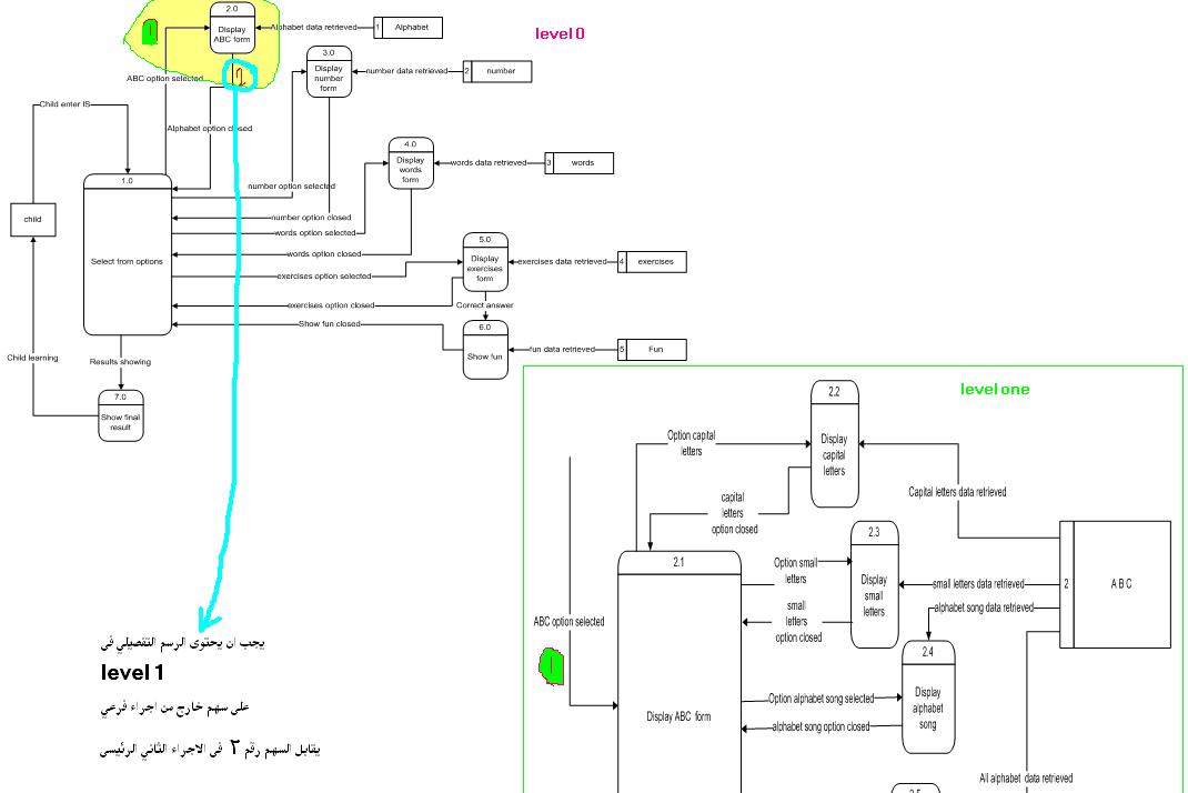بتاريخ: 19 يناير 201016 سنة comment_182789 وعليكم السلام ورحمة الله - جميع الرسومات التفصيلية ستكون على المستوى الأول ... dfd level 1 - يوجد سهم خارج من الاجراء الثاني موجود فى الرسم level 0 alphabet option closed يجب ان يظهر فى المستوى الادنى ... وهو مستوى level 1 في خيار exercises هل نعملها تقسيم مثل abc ,word تجزئة او تقسيم الاجراء decomposition الى مستوى تفصيلى يتحدد حسب حجم العمليات داخلة وهل هى تحتاج الى توضيح وتفصيل اكثر ام لا تقديم بلاغ