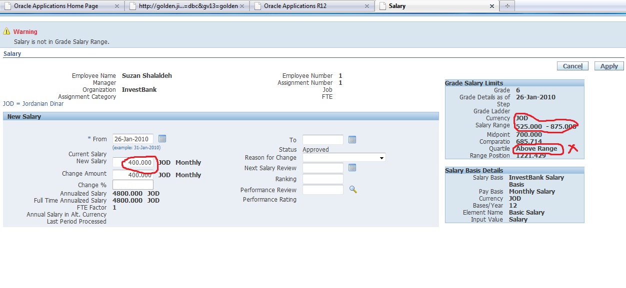 بتاريخ: 4 يونيو 201015 سنة comment_193860 الراتب اقل من range في ال salary scaleلو الموظف راتبه بين 525 و 875 ما عندك اي مشكله .هناك شاشة تعرض بيانات salary scale وهي التي تتحكم في كل شيء حيث يوجد كل جريد و الرانج الخاص بالراتب اقل قيمة و اعلى قيمة و القيمة المتوسطة . تقديم بلاغ
