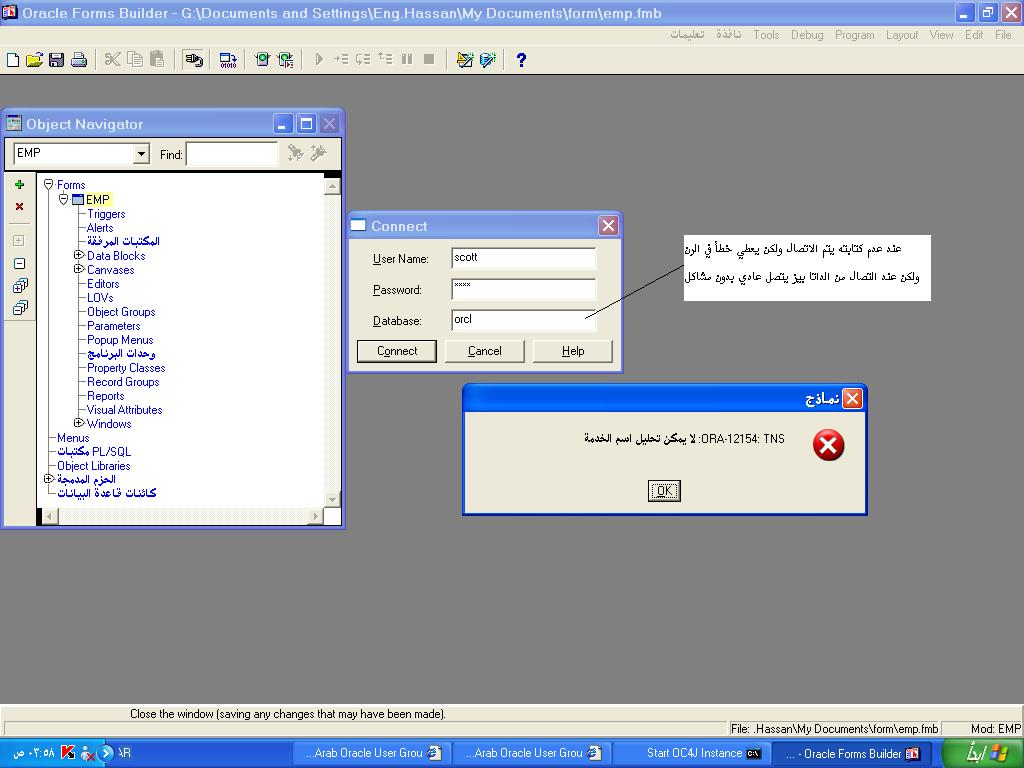 بتاريخ: 11 فبراير 201016 سنة comment_184794 ما عليك سوىان تقوم بنسخ محتويات ملف الــ tns الخاص بقاعدة البيانات وتقوم بلصقه بدل محتويات ملف الـ tns الخاص بالديفلوبرطريقة الوصول الى الملفات: في حال كان لديك قاعدة بيانات 8i1-قم بفتح مجلدالاوراكل الداتابيز ثم من مجلد netowrk افتح ايضا مجلد admin ستجد الملف اسمه TNSNAMES قم بفتحه بواسطة ال notpad وانسخ محتواياته كاملة2-قم بفتح مجلد الديفلوبر وافتح مجلد اسمه net80 ثم افتح ايضا المجلد admin ستجد الملف اسمه TNSNAMES قم بفتحه بواسطة ال notpad وامسح كل ما بداخله والصق البيانات وسوي حفظ.طريقة الوصول الى الملفات: في حال كان لديك قاعدة بيانات 10g1-قم بفتح مجلدالاوراكل الداتابيز D:\oracle\product\10.1.0\Db_1\NETWORK\ADMIN مجلد admin ستجد الملف بداخله واسمه TNSNAMES قم بفتحه بواسطة ال notpad وانسخ محتواياته كاملة2-قم بفتح مجلد الديفلوبر وافتح المجلد اسمه net80 ثم افتح ايضا المجلد admin ستجد الملف اسمه TNSNAMES قم بفتحه بواسطة ال notpad وامسح كل ما بداخله والصق البيانات وسوي حفظ.وجرب ادخل من الديلفوبر واكتب قاعدة البيانات وادخل بسلامموفق إن شاء الله تقديم بلاغ