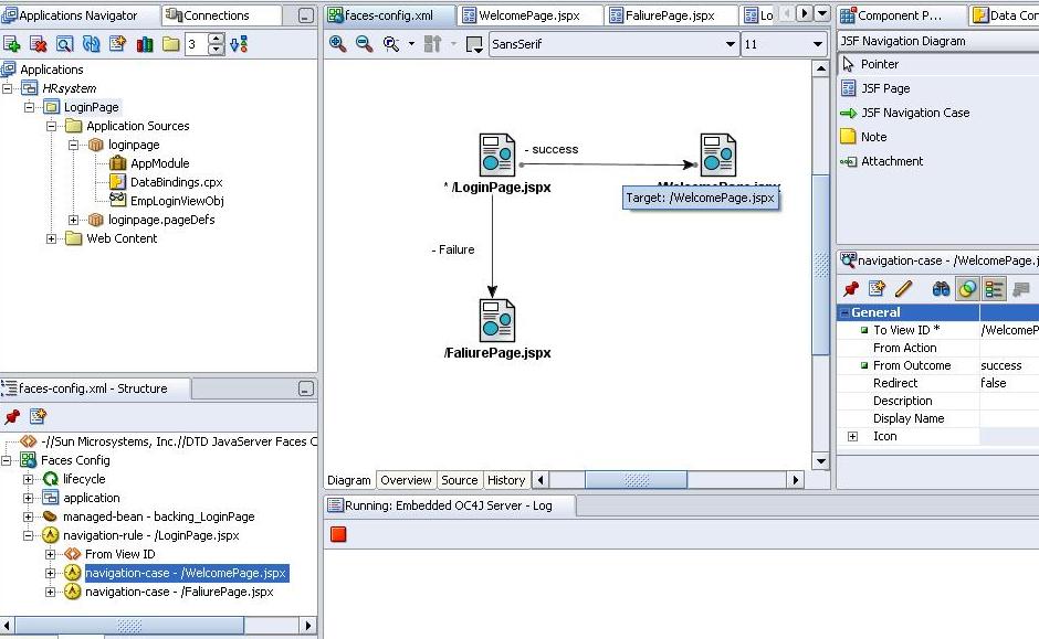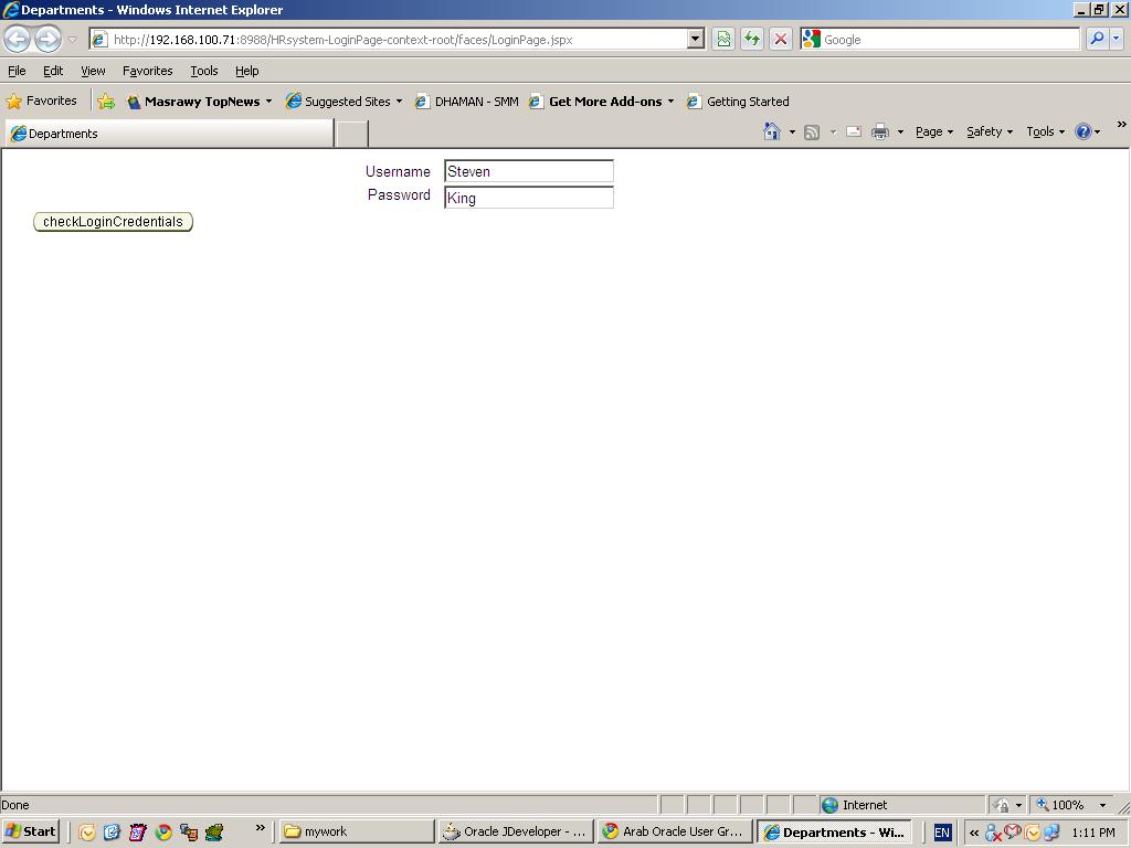 بتاريخ: 15 فبراير 201016 سنة comment_185068 انا لما ضيفت ال method اللى اسمها checkLoginCredentials فى ال class بتاعتى اللى اسمها EmpLoginViewObjImpl اولا :نحن لا نضيف الميثود هنا ولكن اى ميثود احنا محتاجين ان نظهرها فى ال Interface بنضعها فى ال AppModuleImpl وفى المثال ده بنعمل كدهEmpLoginViewObjImpl vo = (EmpLoginViewObjImpl)getEmpLoginViewObj1(); ومعنى ذلك ان اى فيو اوبجكت انت بتضيفه للApplication module بتاعك ؛ ال Application Module بيعمل له Set and Get method فى ال AppModuleImplالايرور اللى عندك انك مكتبتش الميثود دى فى الApplication Module class اللى اسمها ApplicationModuleImpl وبالتالى هو مش شايف الميثود دى لانها موجوده هناك وليس فى EmpLoginViewObjImplخللى بالك فى شرح الكود هنا بينادى على الفيو اوبجكت EmpLoginViewObjImpl vo = (EmpLoginViewObjImpl)getEmpLoginViewObj(); وهنا بيديله الBind Variable بتاعه وبيخليه ينفذ ال Query vo.setNamedWhereClauseParam("LastName",pwd_form); vo.executeQuery(); طبعا لو الفيو اوبجكت ما جابش داتا يبقى اكيد الباسوورد خطا int rowCount=vo.getEstimatedRangePageCount(); if(rowCount==0) { throw new JboException("Password doesn't match"); } } وبعدين بيعرض الميثود فى الClient Interface عشان نقدر نشوفها فى الداتاكنترول كما فى الصورةوبعدين بنعمل ال Navigation Case كما فى الصورة وبعدين بعد مبتعمل Drag and drop للميثود فى الصفحة ك ADF parameter Form بنعمل Double Click على الButton عشان نكتب الكود الموجود فى الTutorial على الButton وشرحه كالتالىهنا بتعرف String عشان يرجع الNavigation Case اللى اسمها "error" String returnStr="error"; وهنا بتستدعى الميثود اللى عملتها فى AppModuleImpl وبتعملها Execute BindingContainer bindings = getBindings(); OperationBinding operationBinding = bindings.getOperationBinding("checkLoginCredentials"); Object result = operationBinding.execute(); وهنا بتقولها لو الميثود اتنفذت من غير اخطاء خللى ال String اللى هو هنا بيمثل ال outcome ب "success" if (operationBinding.getErrors().isEmpty()) { returnStr= "success"; } ملحوظه: ممكن تخلى الFirstName ايضا Bind Variable بحيث انه يكون بدل ال UserName تقديم بلاغ
