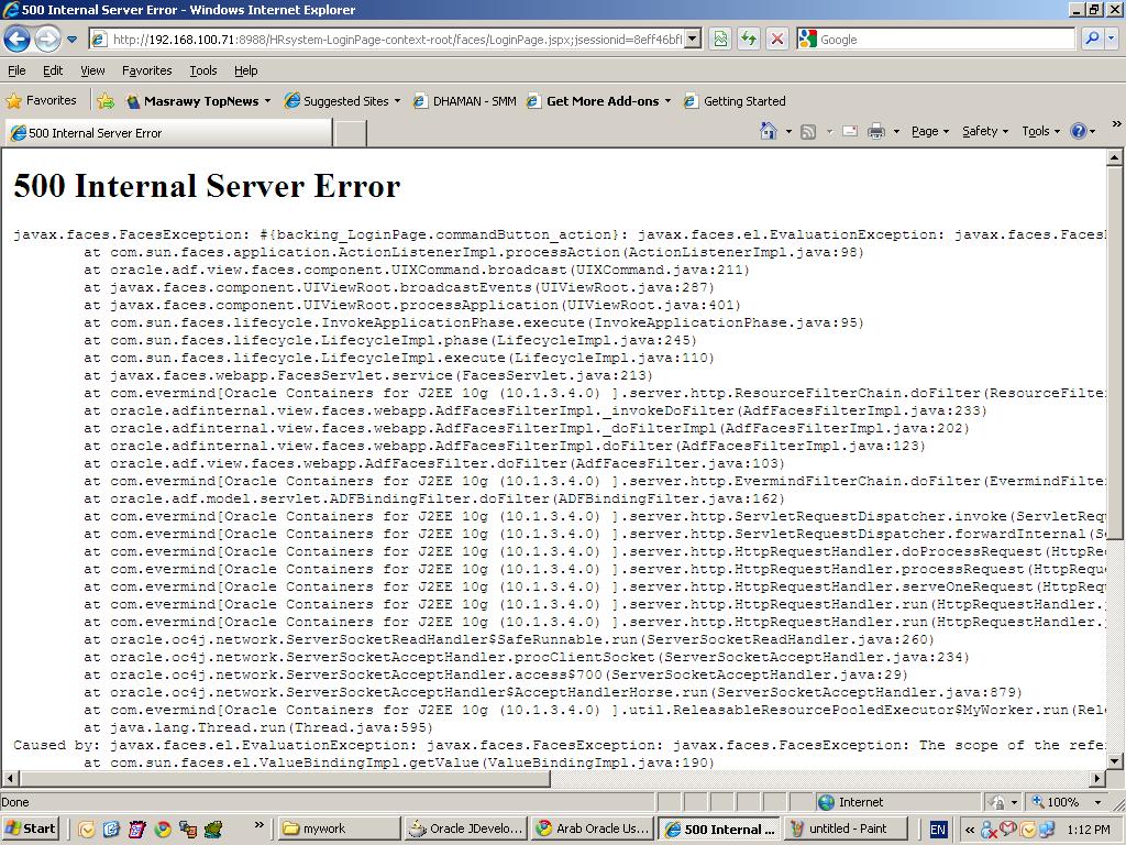 بتاريخ: 16 فبراير 201016 سنة كاتب الموضوع comment_185146 الاخت هاله انا حاولت تانى و عرفت ان الخطأ اللى عملته هو انى ضيفت ال managed_bean للكلاس اللى اسمها AppModuleImpl لكن لما عدلت تانى و ضيفتها للكلاس EmpLoginViewObjImpl اشتغلت كويس و محصلش اخطاءالوقتى بعمل run for the application و فعلا بيظهر ال login page لكن لما اضغط على ال button بيظهر error page كما فى الصورةاعتقد ان المشكلة فى ال navigationهل فى شئ مختلف بنعملة فى ال navigationصورة ال navigation مرفقهو دى اخر السطور اللى بتظهر فى ال error page Caused by: javax.faces.el.EvaluationException: javax.faces.FacesException: javax.faces.FacesException: The scope of the referenced object: '#{bindings}' is shorter than the referring object at com.sun.faces.el.ValueBindingImpl.getValue(ValueBindingImpl.java:190) at com.sun.faces.el.ValueBindingImpl.getValue(ValueBindingImpl.java:143) at com.sun.faces.el.MethodBindingImpl.invoke(MethodBindingImpl.java:143) at com.sun.faces.application.ActionListenerImpl.processAction(ActionListenerImpl.java:92) ... 27 moreCaused by: javax.faces.FacesException: javax.faces.FacesException: The scope of the referenced object: '#{bindings}' is shorter than the referring object at com.sun.faces.application.ApplicationAssociate.createAndMaybeStoreManagedBeans(ApplicationAssociate.java:292) at com.sun.faces.el.VariableResolverImpl.resolveVariable(VariableResolverImpl.java:97) at oracle.adfinternal.view.faces.el.AdfFacesVariableResolver.resolveVariable(AdfFacesVariableResolver.java:40) at oracle.adfinternal.view.faces.model.VariableResolverUtils$JspResolver.resolveVariable(VariableResolverUtils.java:79) at com.sun.faces.el.impl.NamedValue.evaluate(NamedValue.java:145) at com.sun.faces.el.impl.ExpressionEvaluatorImpl.evaluate(ExpressionEvaluatorImpl.java:263) at com.sun.faces.el.ValueBindingImpl.getValue(ValueBindingImpl.java:160) ... 30 moreCaused by: javax.faces.FacesException: The scope of the referenced object: '#{bindings}' is shorter than the referring object at com.sun.faces.config.ManagedBeanFactory.evaluateValueBindingGet(ManagedBeanFactory.java:911) at com.sun.faces.config.ManagedBeanFactory.setPropertiesIntoBean(ManagedBeanFactory.java:567) at com.sun.faces.config.ManagedBeanFactory.newInstance(ManagedBeanFactory.java:253) at com.sun.faces.application.ApplicationAssociate.createAndMaybeStoreManagedBeans(ApplicationAssociate.java:282) تم تعديل 16 فبراير 201016 سنة بواسطة tarek_fathi تقديم بلاغ