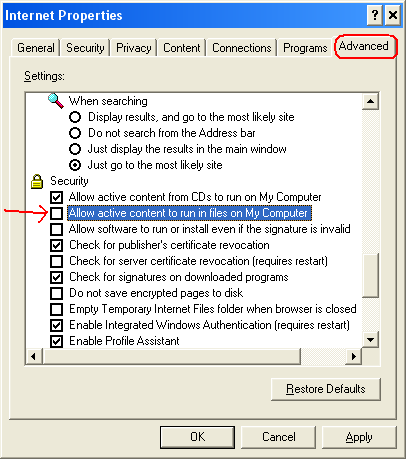 بتاريخ: 24 أبريل 201015 سنة comment_190313 السلام عليكم اخي العزيز هذا هو حل مشكلتك ان شاء اللهادخل الي Internet Explorer Properties ثم اختار Advanced و منه قم بتعليم الاختيار Allow activve content to be run files on my Computerمرفق بالصورةيمكنك استخدام Firefox و لن تقابل هذه المشكلة بالتوفيق-----------------------اخي بخصوصو المسار< HKEY_LOCAL_MACHINE\SOFTWARE\ORACLE\<Developer Suite Home e.g HOME 2<Developer Suite Home e.g HOME 2 هذا الجزء يعتمد علي الاسم الذي استخدمته انت خلال عملية اعداد البرنامج تم تعديل 24 أبريل 201015 سنة بواسطة amdabd تقديم بلاغ