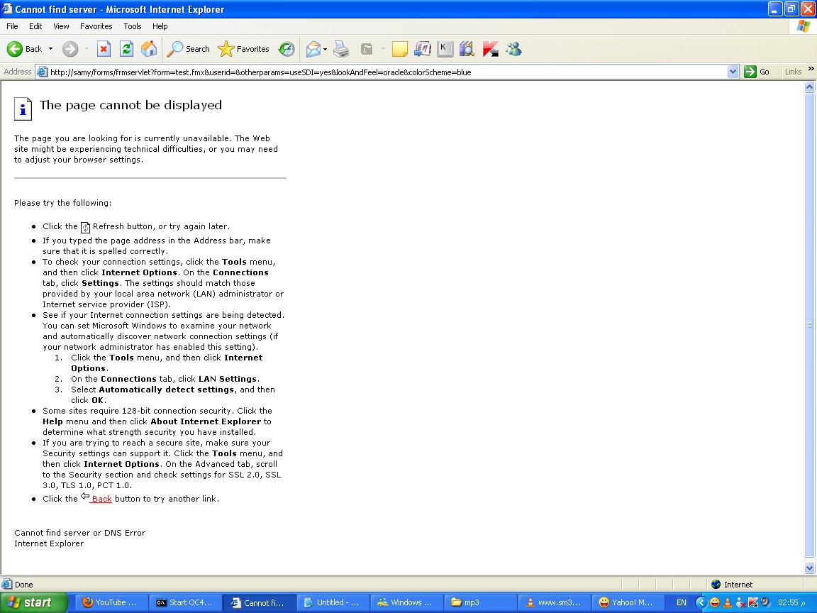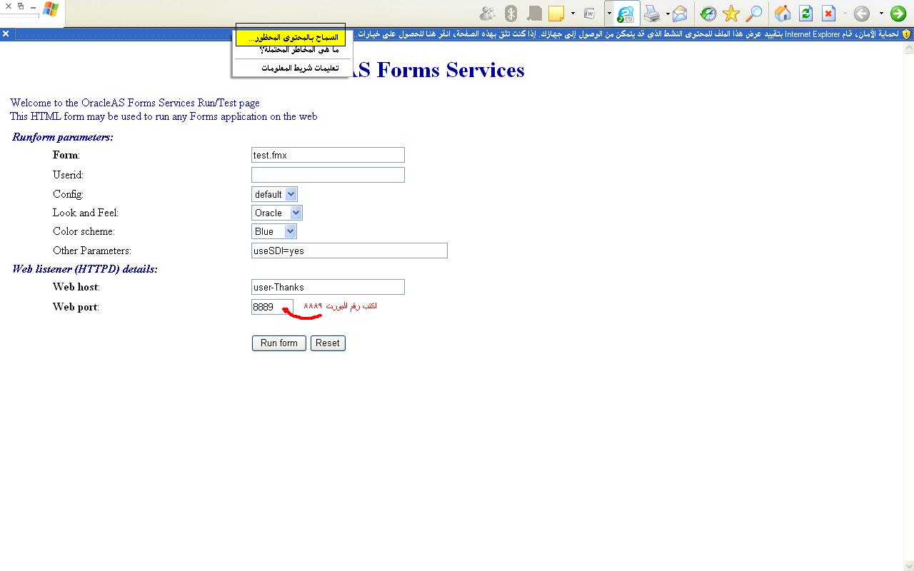 بتاريخ: 6 مايو 201015 سنة comment_191377 السلام عليكم ورحمة الله اخبرنا عن معلومات الجهاز - الwindows المستخدمه - رقم اصدار الfirefox - هل توجد برامج حماية للفيروسات - هل الservices الخاصة بالاوراكل تعمل - هل الفورم التى تستخدمها فى التشغيل من نظام سابق او انها فورم جديده ...- هل تستخدم download manager -ايه معلومات اخرى ... عن محاولاتك السابقة جرب تشغيل الفورم الاختباريه run a form on the web من قائمة البرامج oracle developer suiteforms developerrun a form on the web واخبرنا بالنتيجة ... ويفضل تشغيلها مع المتصفح Internet Explorerمن المفترض ان تظهر لك هذه الصفحة تقديم بلاغ
