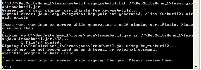 بتاريخ: 14 سبتمبر 201015 سنة كاتب الموضوع comment_199992 انا تخلصت و الحمد لله من المشكله دى والفورمه اشتغلت لكن اى كود فى webutil بيطلع ايرور غريب .و انا شكه فى عمليه sing انا كتبت كده فى الخطوه علما انى قالت الملفات واكد على المسارت .c:\DevSuiteHome_1\forms\webutil\sign_webutil.bat c:\DevSuiteHome_1\forms\java\frmwebutil.jarc:\DevSuiteHome_1\forms\webutil\sign_webutil.bat c:\DevSuiteHome_1\forms\java\jacob.jarالرساله اللى طلعت Microsoft Windows XP [Version 5.1.2600]© Copyright 1985-2001 Microsoft Corp.C:\Documents and Settings\ra>c:\DevSuiteHome_1\forms\webutil\sign_webutil.bat c:\DevSuiteHome_1\forms\java\frmwebutil.jarGenerating a self signing certificate for key=webutil2...keytool error: java.lang.Exception: Key pair not generated, alias <webutil2> already exists.There were warnings or errors while generating a self signing certificate. Please review them..Backing up c:\DevSuiteHome_1\forms\java\frmwebutil.jar as c:\DevSuiteHome_1\forms\java\frmwebutil.jar.old... 1 file(s) copied.Signing c:\DevSuiteHome_1\forms\java\frmwebutil.jar using key=webutil2...'jarsigner' is not recognized as an internal or external command,operable program or batch file..There were warnings or errors while signing the jar. Please review them.C:\Documents and Settings\ra>c:\DevSuiteHome_1\forms\webutil\sign_webutil.bat c:\DevSuiteHome_1\forms\java\jacob.jarوده شكل اليرور يا جماعه انا فعلا تعبت ارجو المساعده.وجزكم الله خير تقديم بلاغ