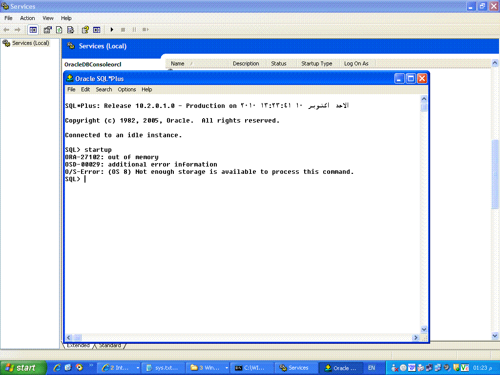 بتاريخ: 10 أكتوبر 201015 سنة comment_201215 السلام عليكم و رحمة الله و بركاته لدي مشكلة ارجو المساعدة من زوي الخبرات في هذا الامر .قمت بزيادة البراميتر Sga_target بحد اقصي مما يجب و قمت بعمل Sutdown immediate و عند عمل Startup ظهرت رسالة Ora-27102 -out of memory علما بأني مستخدم لنظام تشغيل Windows XP فكيف استطيع بالخطوات اعادة تشغيل قاعدة البيانات و جزاكم الله خيرا رجاء سرعة الرد لان الموضوع متعلق بقاعدة بيانات كبيرة و ضخمو لعميل ضخم [email protected] تقديم بلاغ