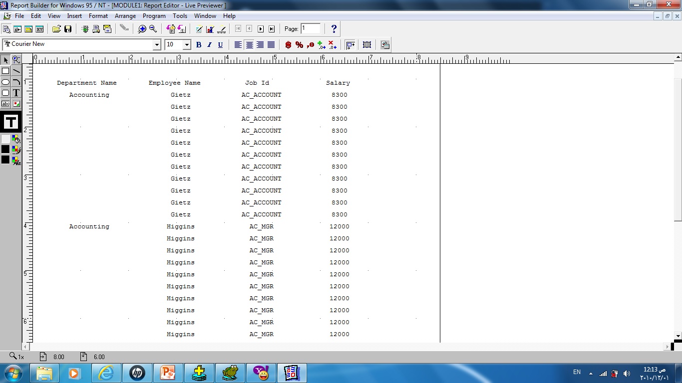 بتاريخ: 30 نوفمبر 201015 سنة comment_204500 السلام عليكمانا كنت عملت مشاركة قبل كده بنفس المشكلة وهى تكرار البيانات ولكن للاسف المشكلة مازالت موجودة فانا هرفع الشكل اللى بيظهرلى وكمانجملة الاستعلام SELECT D.DEPARTMENT_NAME,E.LAST_NAME,E.JOB_ID,E.SALARY FROM DEPARTMENTS D JOIN EMPLOYEES E ON (D.DEPARTMENT_ID=E.DEPARTMENT_ID) تم تعديل 2 مايو 201411 سنة بواسطة Ahmad.Hasan تقديم بلاغ