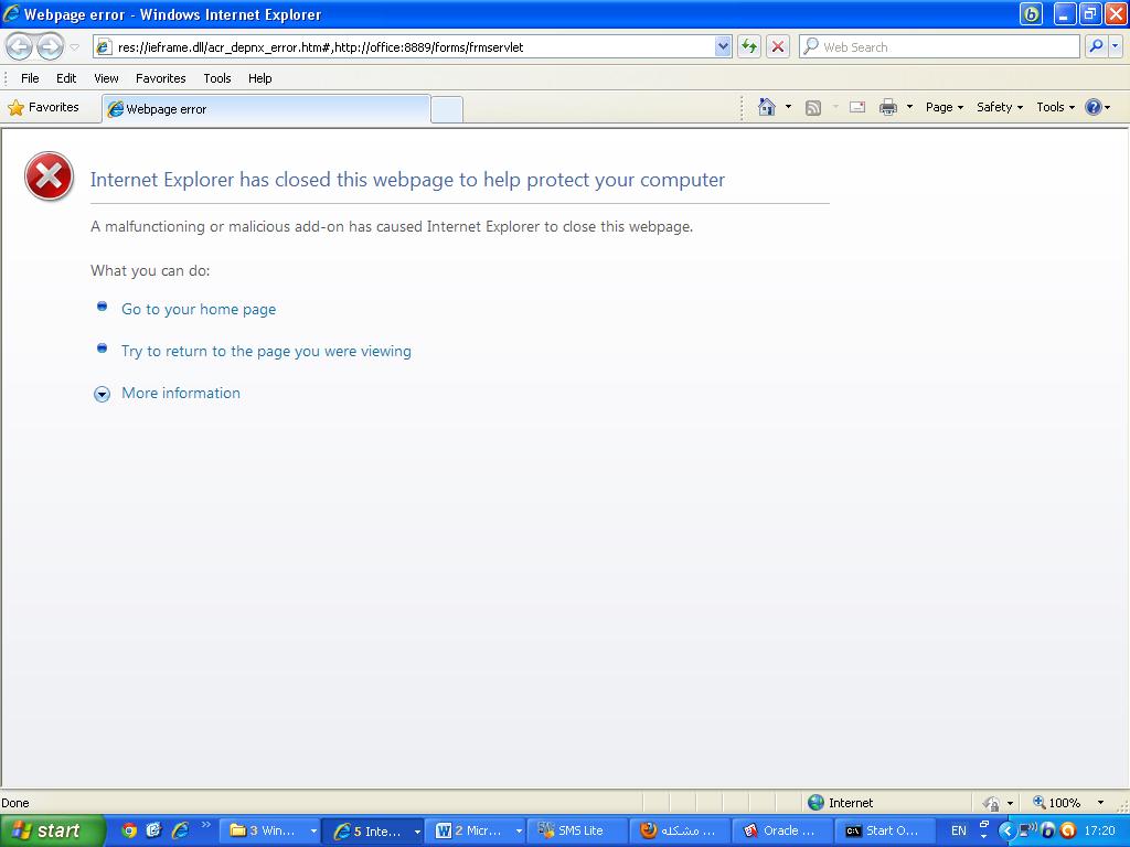 بتاريخ: 5 يوليو 201114 سنة comment_213709 السلام عليكممشكله فى عمل runودا ال URLres://ieframe.dll/acr_depnx_error.htm#,http://office:8889/forms/frmservletاريد حل فى عمل رن للفورمزماهى المشكله ارجو المساعده تقديم بلاغ